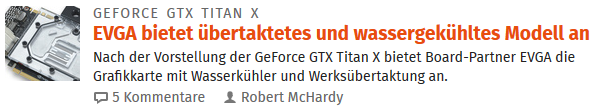 Wenn ich mich hier nicht zuerst auf die optisch wenig prominente Zeile "GeForce GTX Titan X" konzentriere, kann ich mit der allgemeinen Headline "EVGA bietet übertaktetes und wassergekühltes Modell an" nichts anfangen.