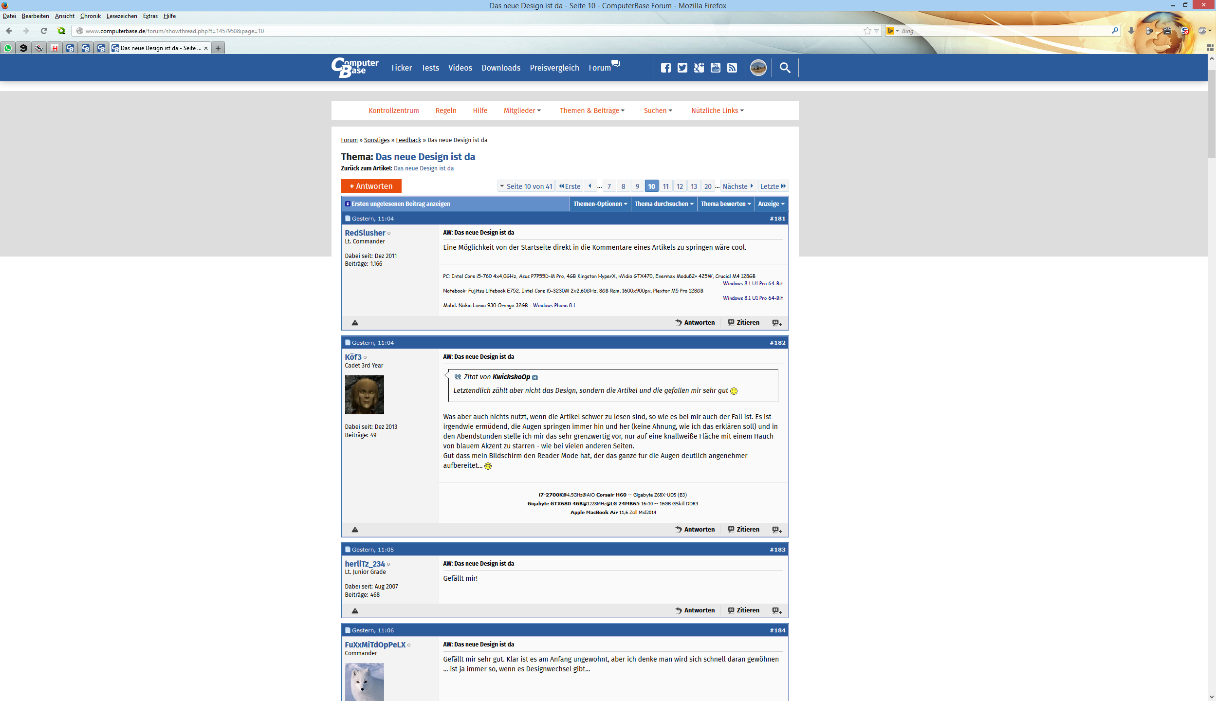 Anbei noch ein Screenshot des Forums, wie es bei mir dargestellt wird. Die Schrift ist einfach zu fett, da ist teilweise so gut wie gar kein Platz zwischen den einzelnen Zeichen. Da auch die Benutzernamen in den Threads in der selben Formatierung sind, trifft das Problem auch dort zu. Noch schlimmer ist die oberste Zeile jedes Posts ("AW: Das neue Design ist da"), die ist die schlimmste von allen.
