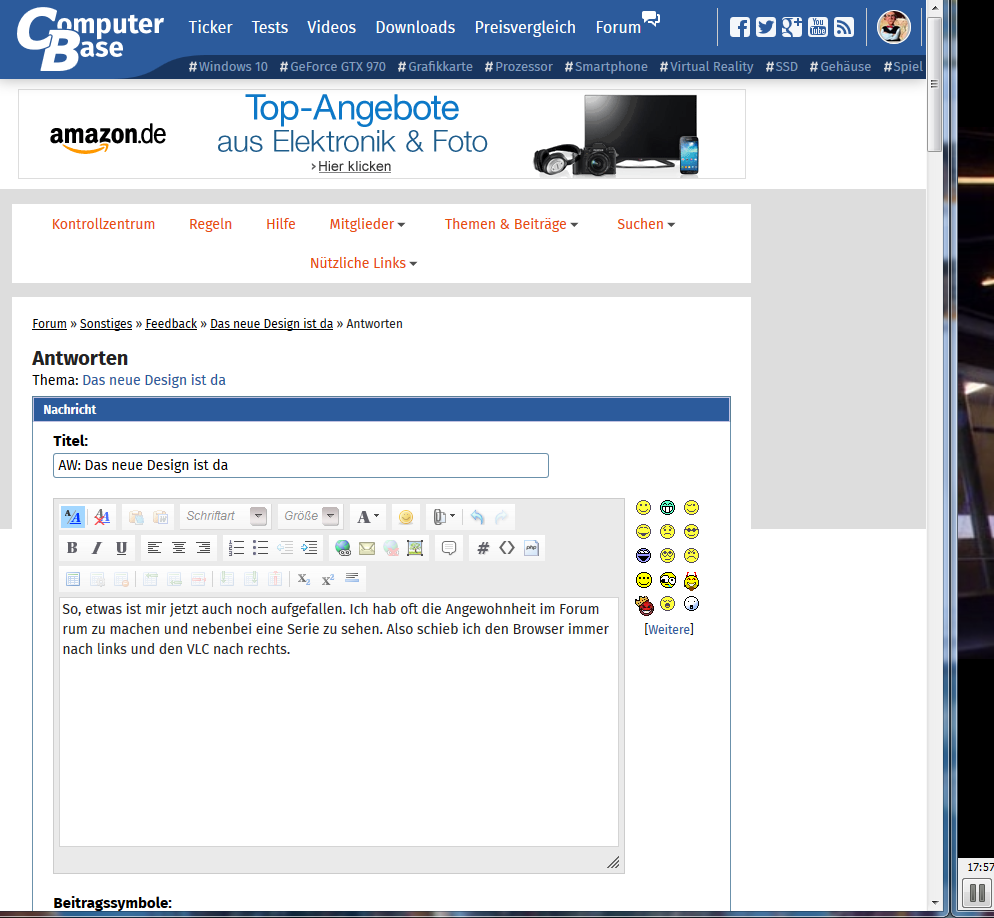 So, etwas ist mir jetzt auch noch aufgefallen. Ich hab oft die Angewohnheit im Forum rum zu machen und nebenbei eine Serie zu sehen. Also schieb ich den Browser immer nach links und den VLC nach rechts. Das Layout ist auf "Flexieble Breite" gestellt. Bei Fester Größe bleiben die "Nützlichen Links" in der Spalte. Außerdem fehlt die Suchlupe. Ein Balken zum verschieben erscheint dann nicht. Meine Auflösung beträgt 1920 x 1080.
