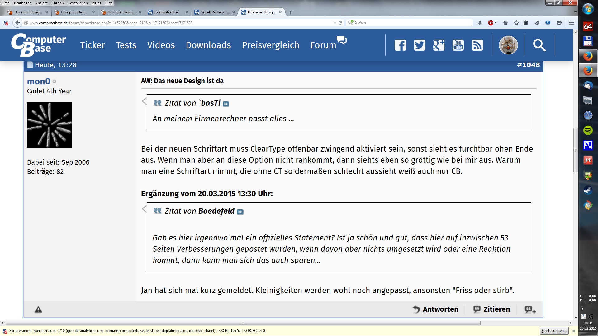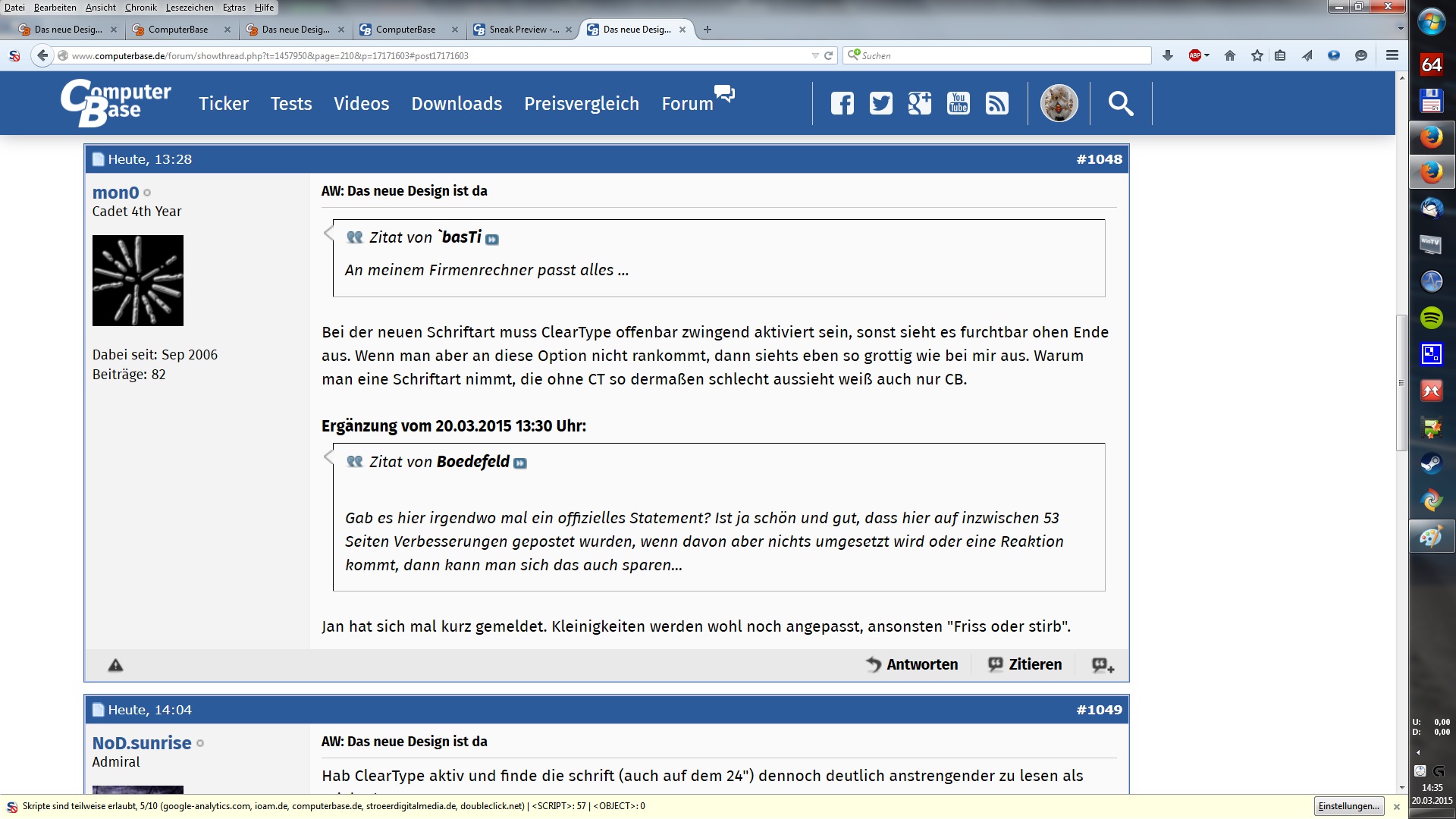 Bei der neuen Schriftart muss ClearType offenbar zwingend aktiviert sein, sonst sieht es furchtbar ohen Ende aus. Wenn man aber an diese Option nicht rankommt, dann siehts eben so grottig wie bei mir aus. Warum man eine Schriftart nimmt, die ohne CT so dermaßen schlecht aussieht weiß auch nur CB.