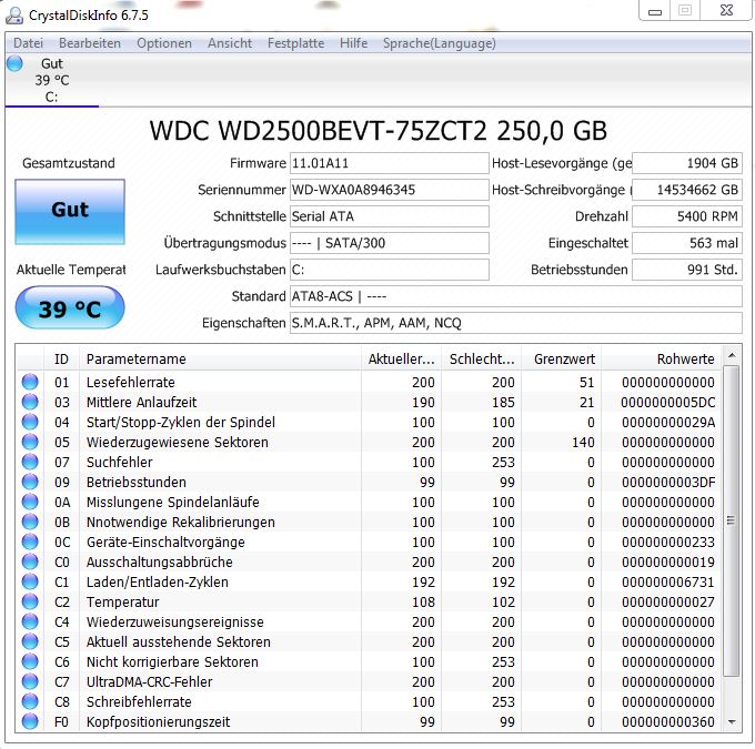 Es scheint aber von den SMART-Werten her gut auszusehen. D. h. die Platte ist wahrscheinlich i.O.
