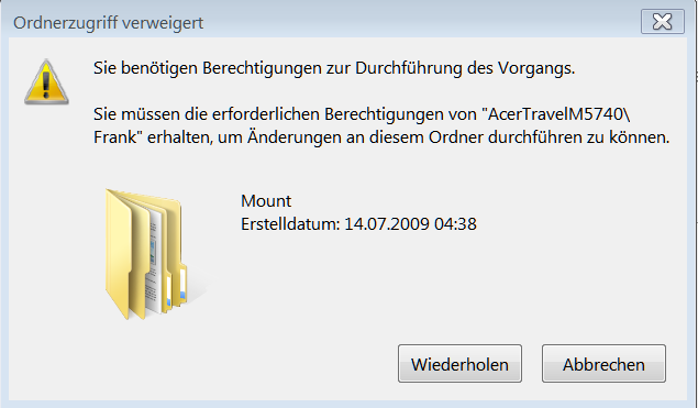Danach konnte ich aber auf C zugreifen. Als ich dann den Ordner löschen wollte kam: