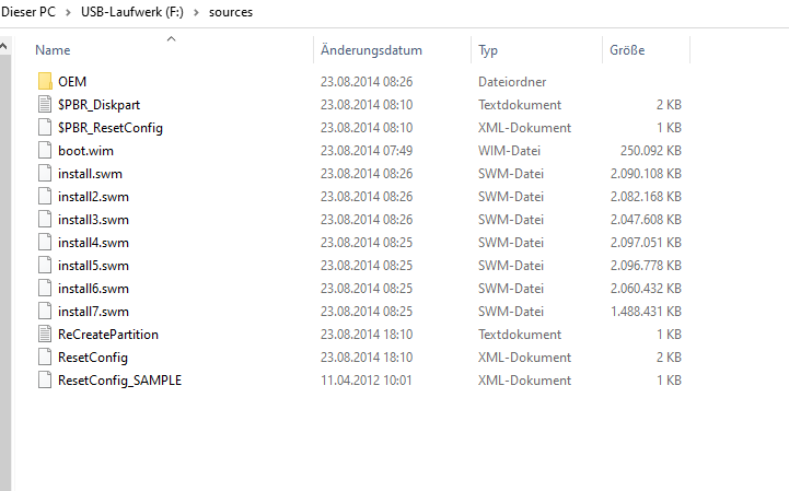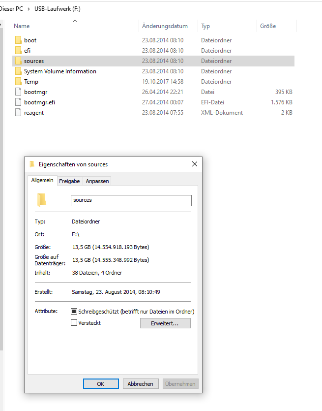 Auf dem Stick waren seit dem Kauf (SanDisk, ALDI) bereits Ordner vorinstalliert. Ich habe keine Ahnung, was diese bedeuten. Ich weiß nur, dass der Ordner "Sources" 13 GB groß ist, also genau der Größe meiner gespeicherten Dateien entspricht. Die Dateien sind in diesem Sources-Ordner aber nicht zu finden.