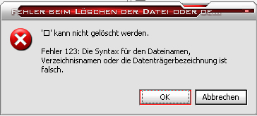 Der Speedcommander sagt mir, das der Fehler 123 aufgetreten ist und die Syntax für den Dateinamen, Verzeichnisnamen oder die Datenträgerbezeichnung falsch ist.