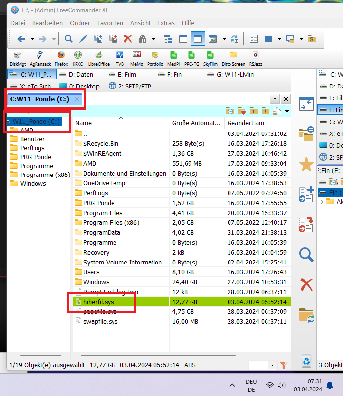 Wo soll den diese markierte 12gb hiberfil.sys sein? Wie man rechts sieht, liegen in dem Pfad nur 2 einzelne Dateien.