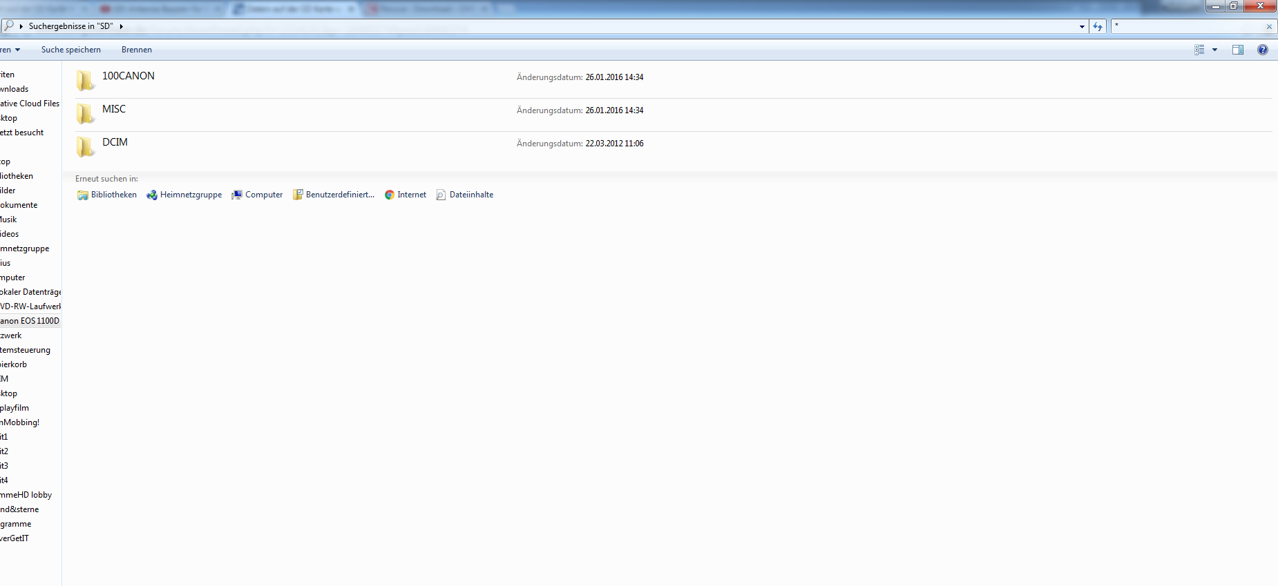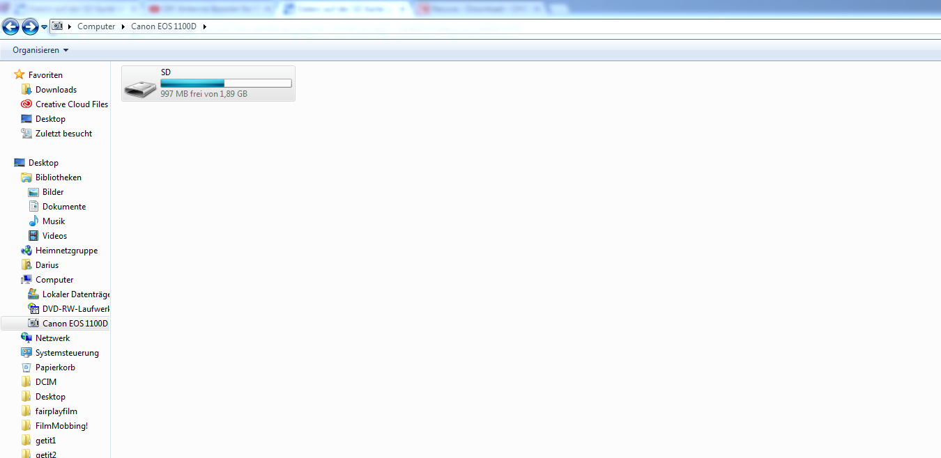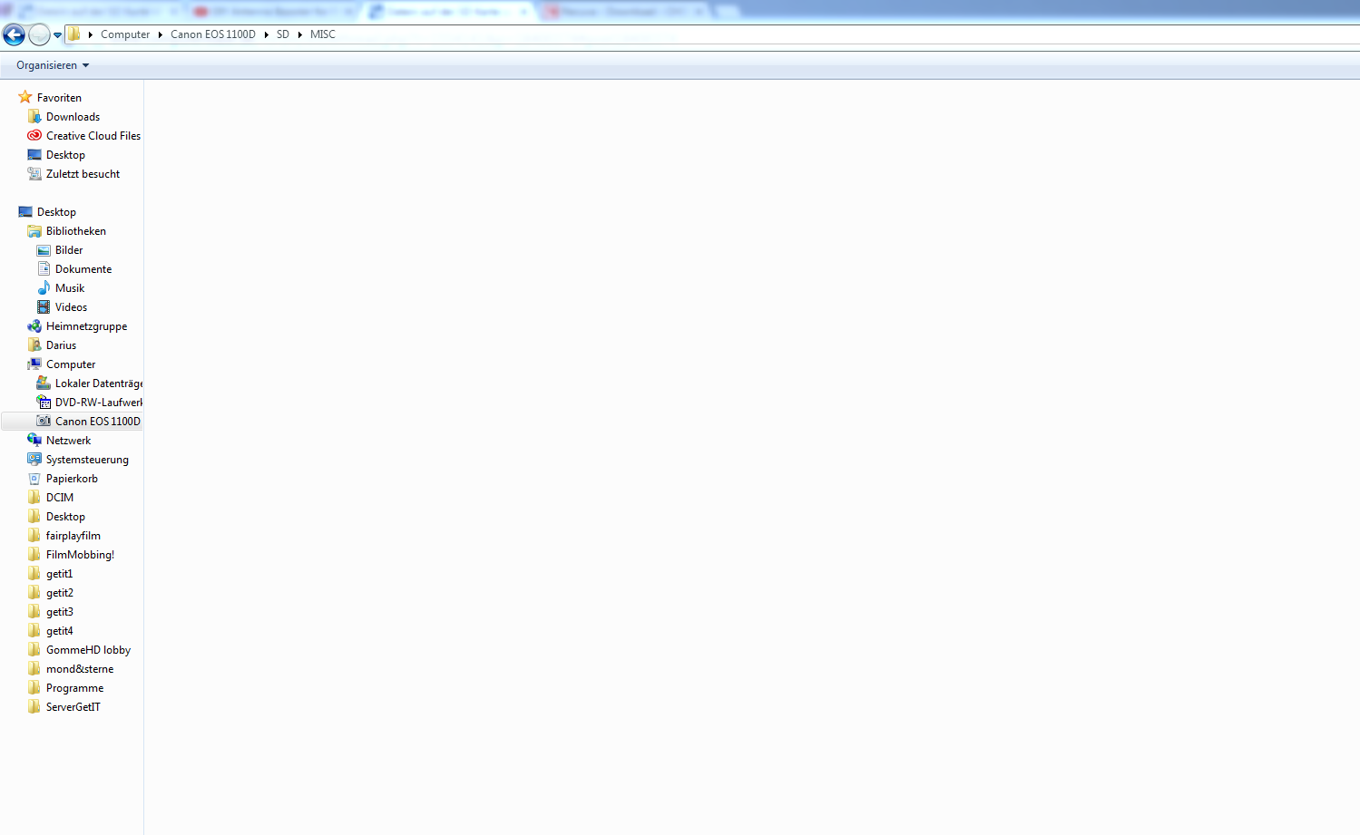 WIr haben ein Film in der Schule gedreht und jetzt wo ich ihn schneiden wollte, wird aus der SD Karte(von der 1 Kamera, haben mit 2 Kameras gefilmt) nichts angezeigt.Ich mache es so das ich die SDaArte in meine Canon EOS 1100d stecke und dann die Kamera mit USB verbinde.Es wird angezeigt das die Hälfte der SDKarte belegt ist jedoch befindet sich im Ordner "DCIM" und "MISC" nichts..Auch wenn ich auf der Kamera gucke steht da "Keine Bilder vorhanden".Habe schon versucht" versteckte Ordner" Sichtbar zumachen aber immer noch nichts..