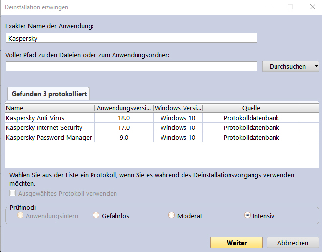 Da du den Revo Uninstaller verwendest, installiere Kaspersky noch einmal und überwache die Installation mit dem Revo Uninstaller, entferne dann die Kaspersky Installation mit dem Revo Uninstaller vollständig.