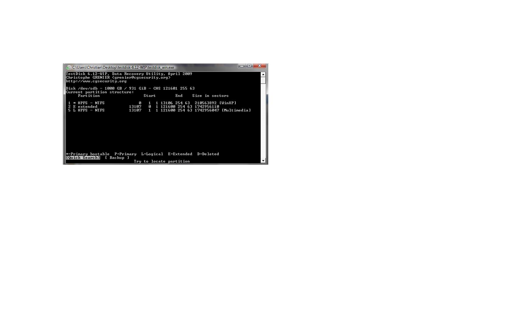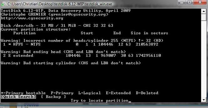 Danach zeigte mir Testdisk an, dass die Heads per Cylinder falsch eingestellt waren. Nachdem ich die geändert hatte und mit Write den Partitiontable neu schreiben lassen wollte, zeigte mir Testdisk eine Fehlermeldung an, nach der nichts gschrieben wreden konnte wegen irgendeines Fehlers. Interessanterweise wurden aber nach Neustart sämtliche Partitionen in Win angezeigt und lassen sich wieder verwenden.