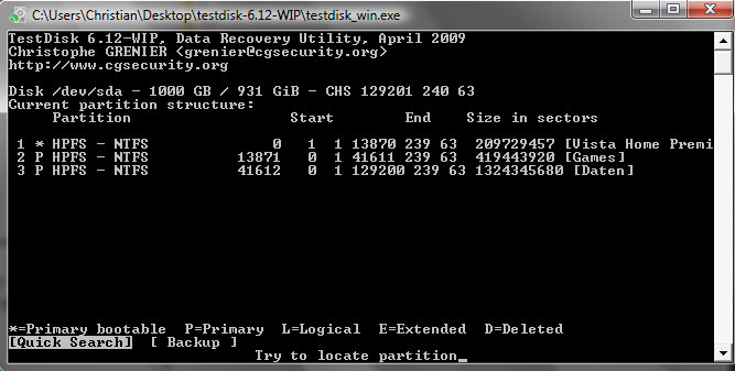 Nach dem Start von Testdisk beantwortest Du die Frage nach einer Logdatei mit Y. Den Partitionstyp solltest Du mit Intel beantworten. Dann wird Analyse aus dem dann erscheinenden Menü gewählt. Mit Quick Search wird dann der Vorgang fortgeführt (bei Vista mit Y antworten, wenn die Partitionierung unter diesem OS gemacht wurde).