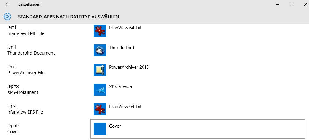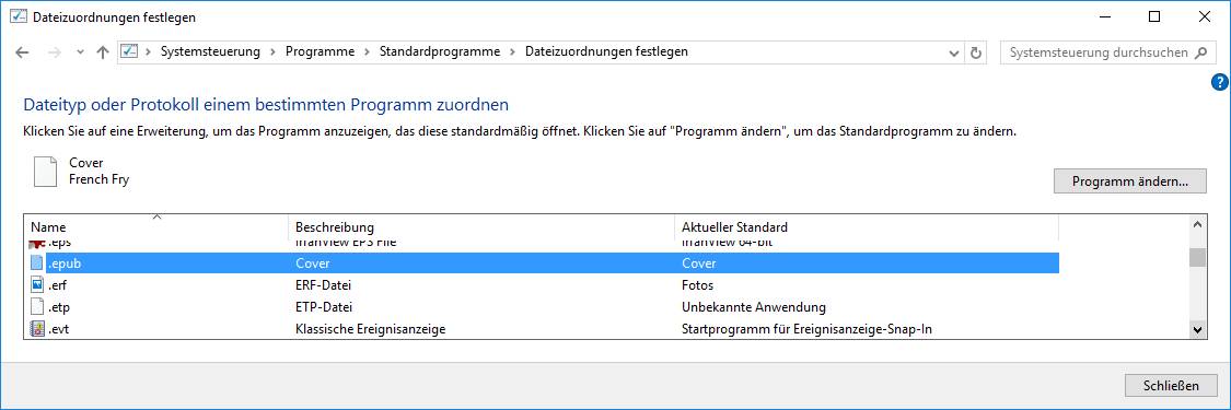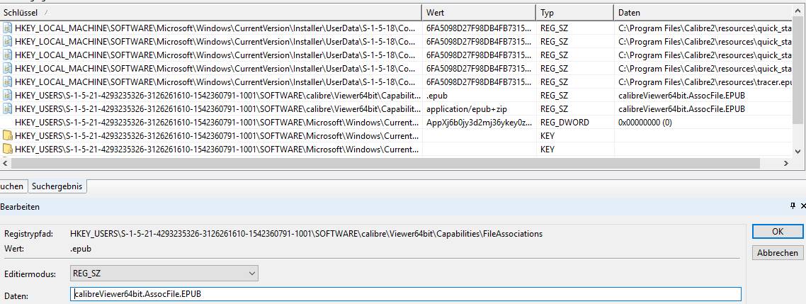 Zuerst hatte ich das Problem mit .pdf-Dateien, welches ich zuerst mit SumatraPDF verwenden wollte. Hier habe ich mich damit beholfen, den Adobe Acrobat Reader zu installieren. Nun habe ich das gleiche Problem mit .epub-Dateien, die sich ums verrecken nicht mit Calibre automatisch öffnen lassen. Dieser Dateityp wurde falsch durch die Installation der App Cover verknüpft, und sie ist per Programmoberfläche nicht änderbar. Seltsamerweise ist in der Registry durch die Programmänderung der Wert korrekt eingetragen (siehe Screenshots).