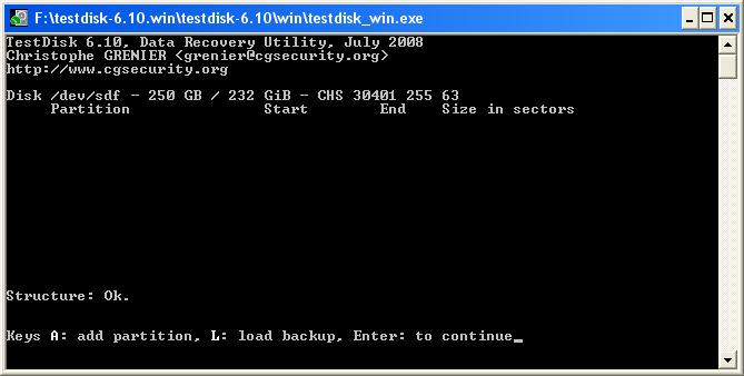 Mit Testdisk erreiche ich folgendens (siehe Dateianhang unbenannt.jpg). Ich kann keine Partition auswählen, die Festplatte wird aber erkannt und die 'Structure' ist ok..???
