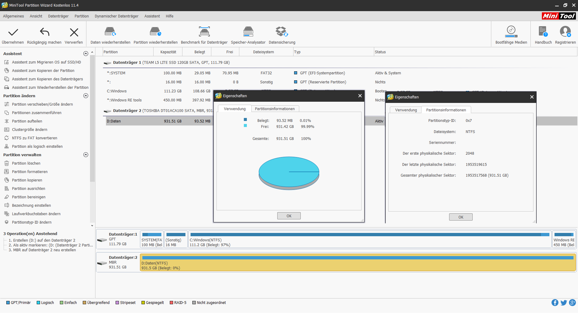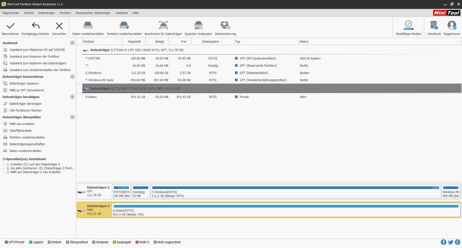 Ich habe dann das Programm MiniTool Partition Wizzard installiert. Dies war der Anfang von meiner Hölle. Ich habe versucht mit Hilfe des Programms die Festplatte irgendwie benutzbar zu machen. Ich habe versucht erstmal alle Daten in der Festplatte zu bereinigen. Ich muss dazu sagen, dass ich mich mit dem Programm nicht gut auskenne. Leider habe ich aus versehen meine andere, im PC verbaute interne Festplatte ausgewählt, die ebenfalls von toshiba ist und die selbe Kapazität hat. Daher habe ich sie verwechselt. Ein dummer Fehler. Ich weiß.