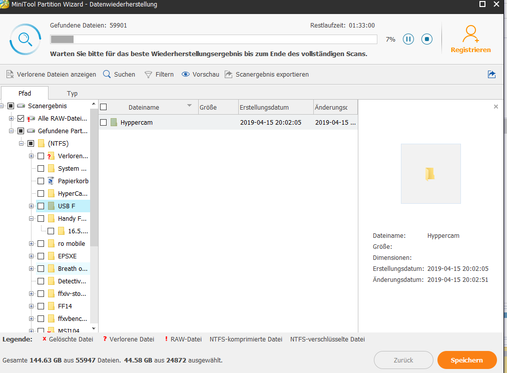 ich habe versucht die Funktion Daten widerherstellen anzuklicken. Nach einem Scan, der über eine Stunde ging zeigte er mir die verschwundenen Daten der Festplatte an. Doch ich kann sie nicht wiederherstellen, denn das Programm erlaubt nur eine Menge von nicht mehr als 1GB, die man wiederherstellen kann. Denn dann muss man eine Lizenz kaufen.