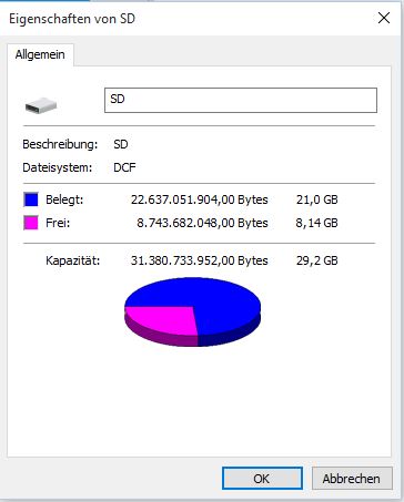 Bei Dateisystem steht DCF und über 20GB sind angeblich belegt.