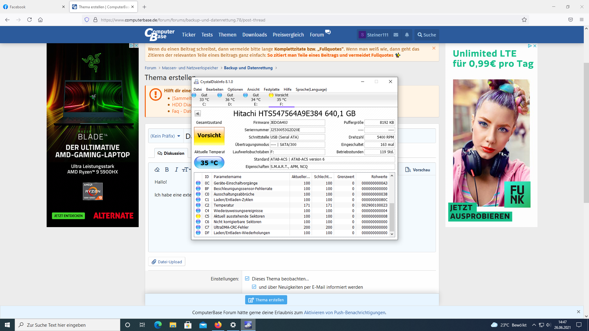 Ich habe eine externe HDD (von intenso, von 2011), 640 GB ca 338 GB belegt. ich kann zwar auf die auf die HDD zugreifen auch auf daten, aber kann die daten nicht auf interne SSD ( 1 TB) sichern, was kann ich machen?