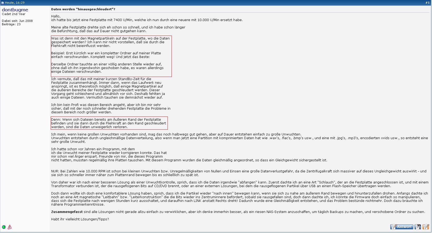Die Platte ist übrigens gerade mal ein halbes Jahr alt, aber mich würde es nicht wundern wenn das Teil nun komplett im Eimer ist. Einem Freund von mir ist die gleiche Platte nach wenigen Monaten kaputt gegangen. Bei Google findet man dazu noch jede Menge andere Fälle. Samsung Festplatten kommen mir jedenfalls nicht mehr ins Haus...
