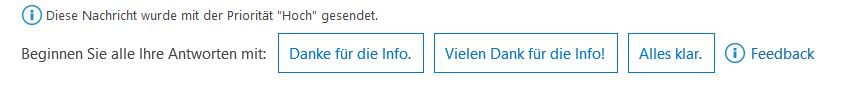 Wenn ich meine Mails im Posteingang anschaue, gibt es immer häufiger drei mögliche Antwortmöglichkeiten (wenn man draufklickt, wird eine Art "Mini-Mail" als Antwort verschickt), deren Antworten vom Text abhängig ist. Im Screenshot mal ein einfaches Beispiel.habla2k schrieb:Wir nutzen auch Outlook, aber so etwas wie ne Auto-Antwort habe ich noch nirgends gesehen, gilt das nur für bestimmte Versionen?