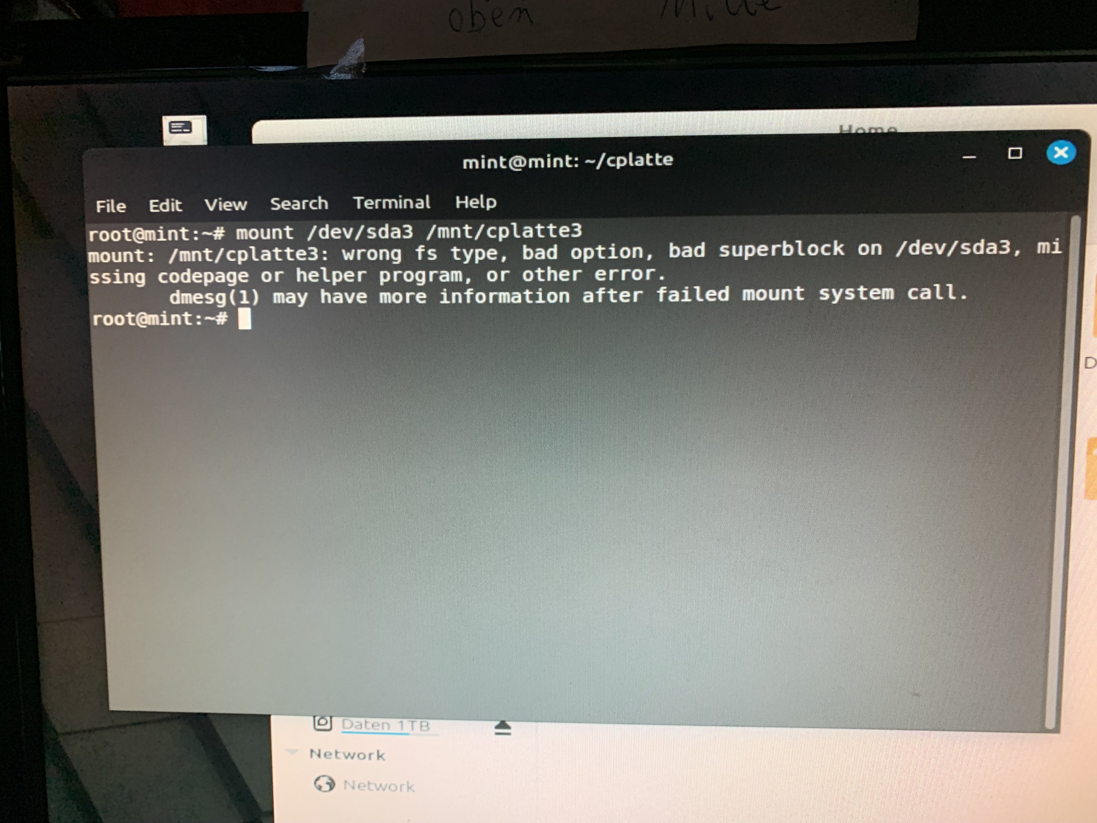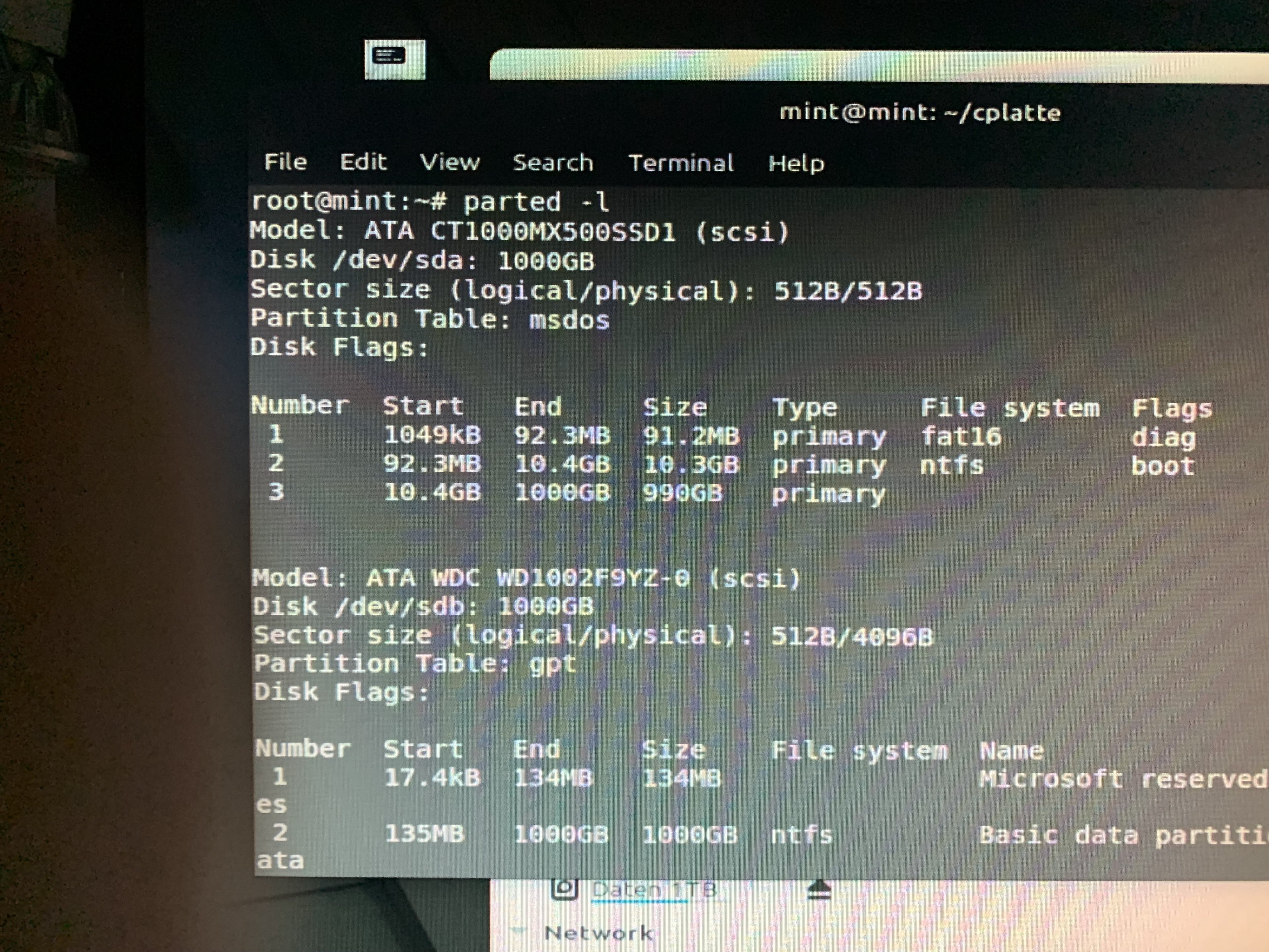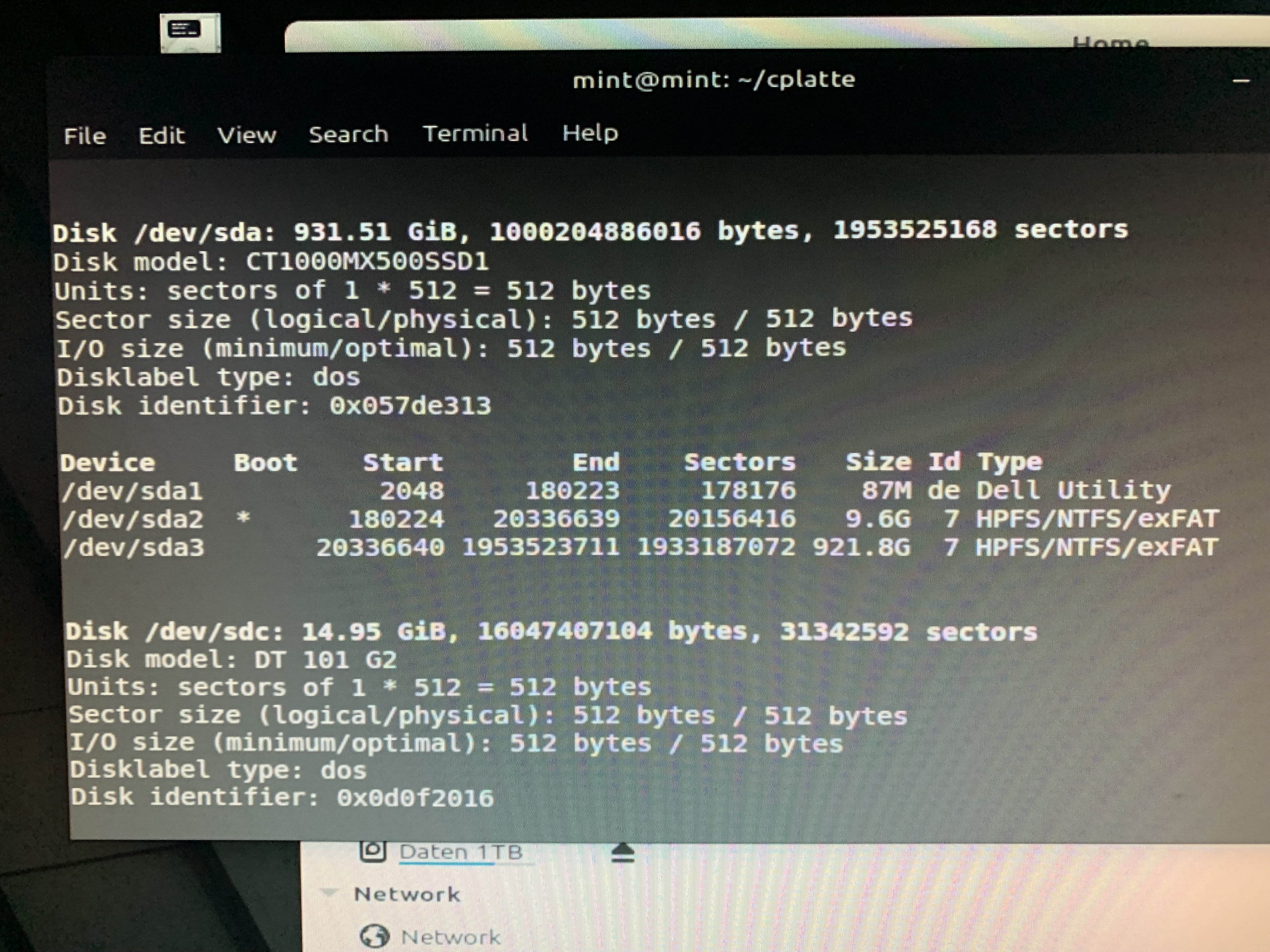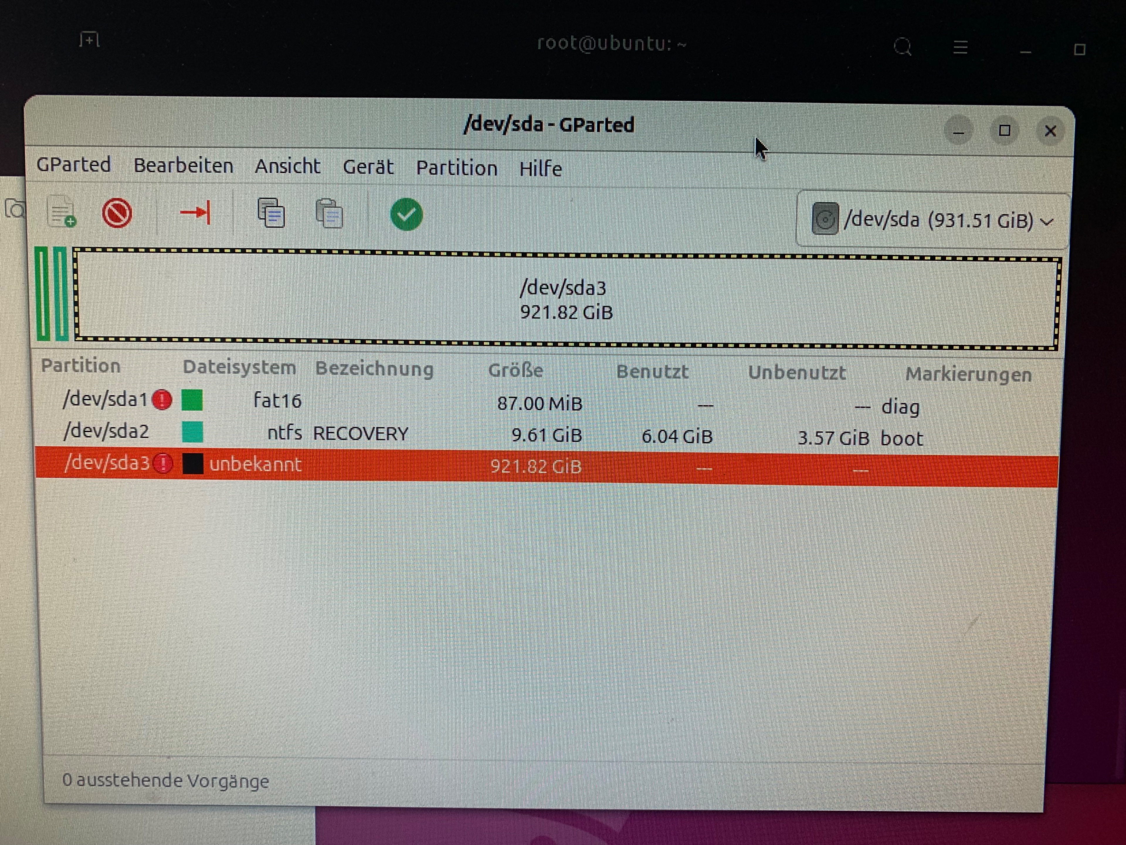 Ich habe einen UBS-Stick mit Ubuntu Dekstop drauf. Wenn ich damit boote sehe ich meine D-Platte. In GParted kann ich auch /dev/sda mit 3 Partitionen sehen: sda1, sda und sda 3 (Screenshot anbei).