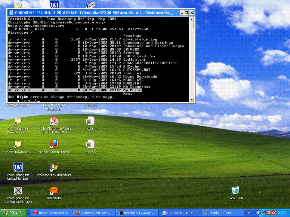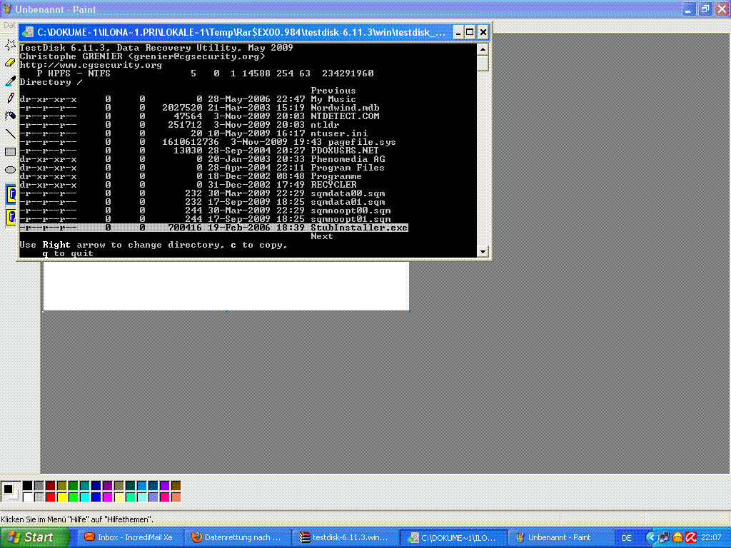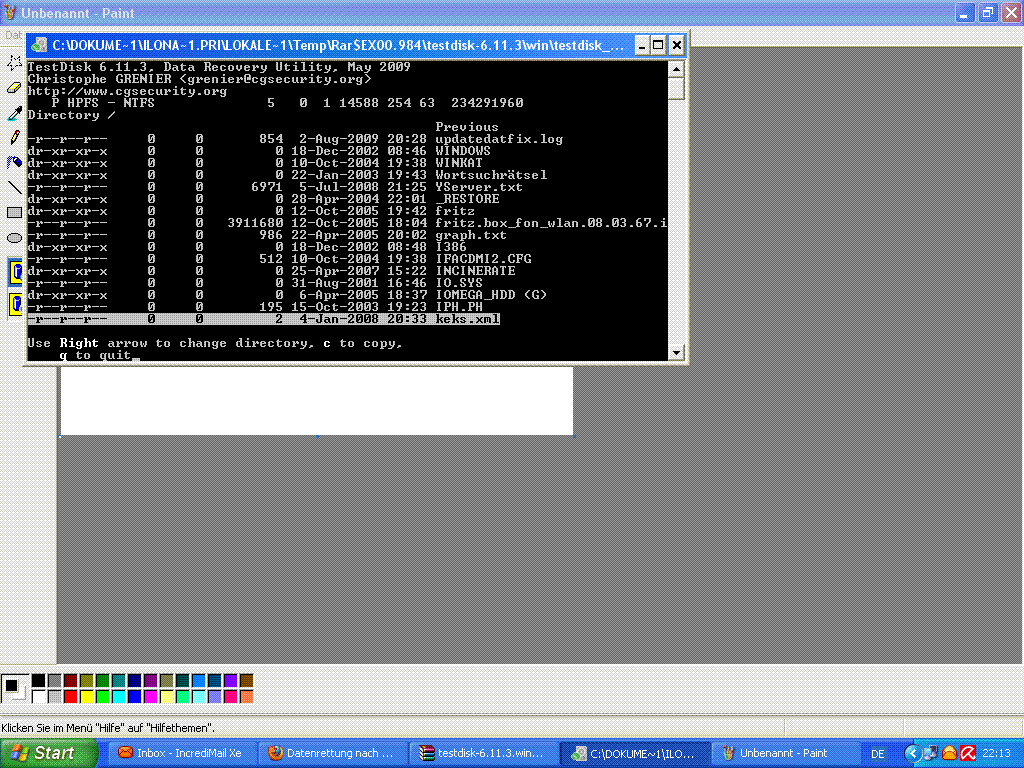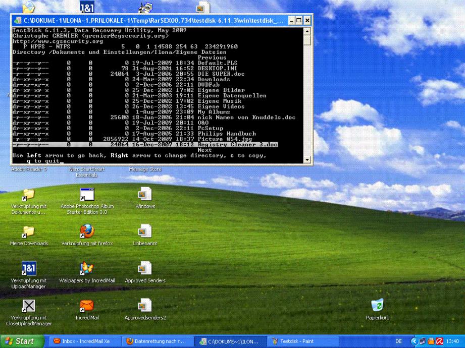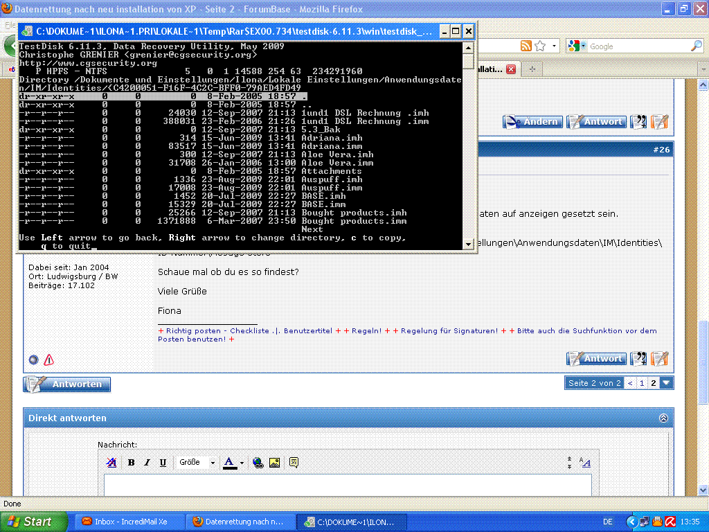 Eigentlich habe ich auch die Rechte von den Konten übernommen wo die meisten Daten drin waren. Dann habe ich mit testdisk gescannt und unter Dokumente und Einstellungen/Ilona/Eigene Datein habe ich dann meine verloren geglaubten Daten gefunden, wie in dem 4 Bild oben ersichtlich.