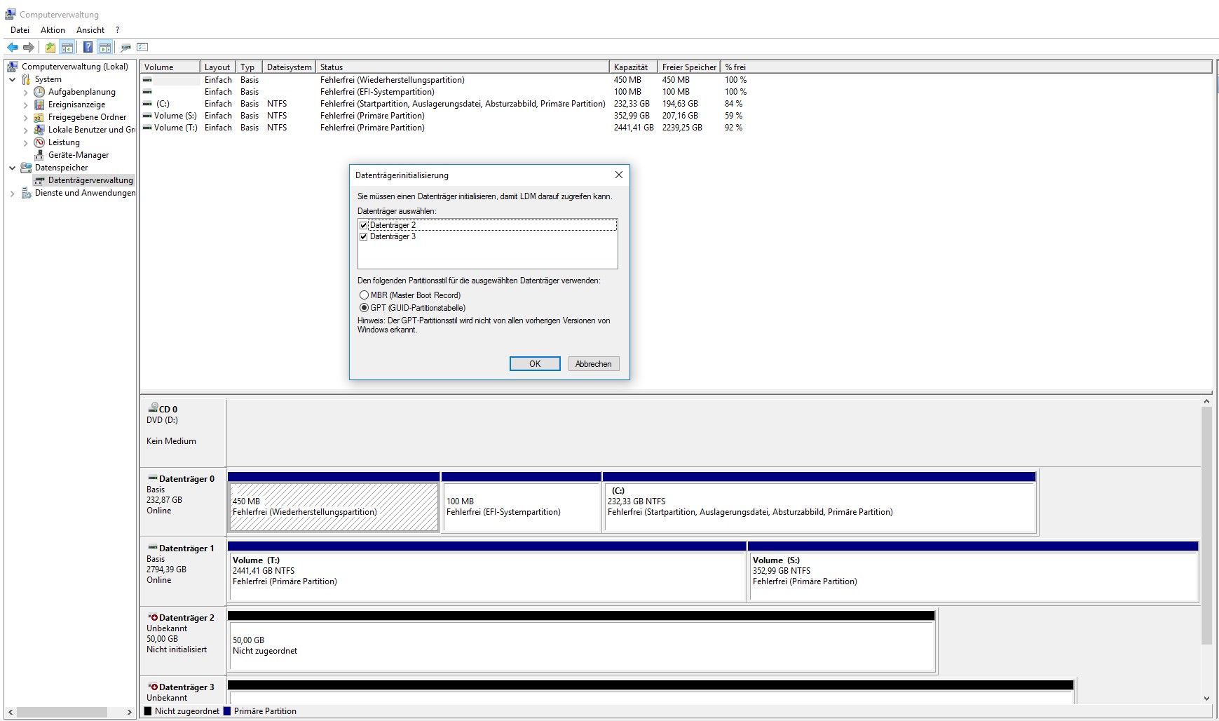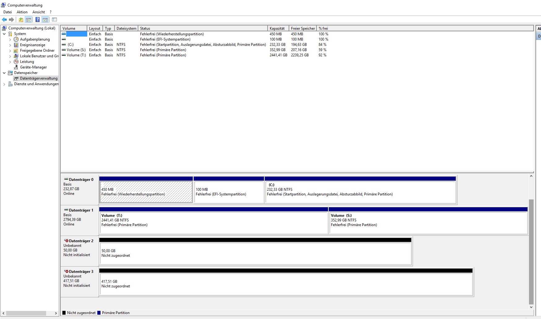 HDD1 ist mit hoher Wahrscheinlichkeit die SSD, diese sieht soweit in Ordnung aus und enthält auch eine gültige NTFS-Partition. HDD2 passt von der Größe auf die 3 TB HDD und diese ist soweit auch in Ordnung. HDD3 hat angeblich in etwa 50 GB, HDD4 wird mit etwa 417 GB erkannt, was zusammen in etwa 2x 250 GB ergeben würde und doch stark für ein defektes RAID sprechen würde. Kannst du noch einen Screenshot der Windows Datenträgerverwaltung machen?