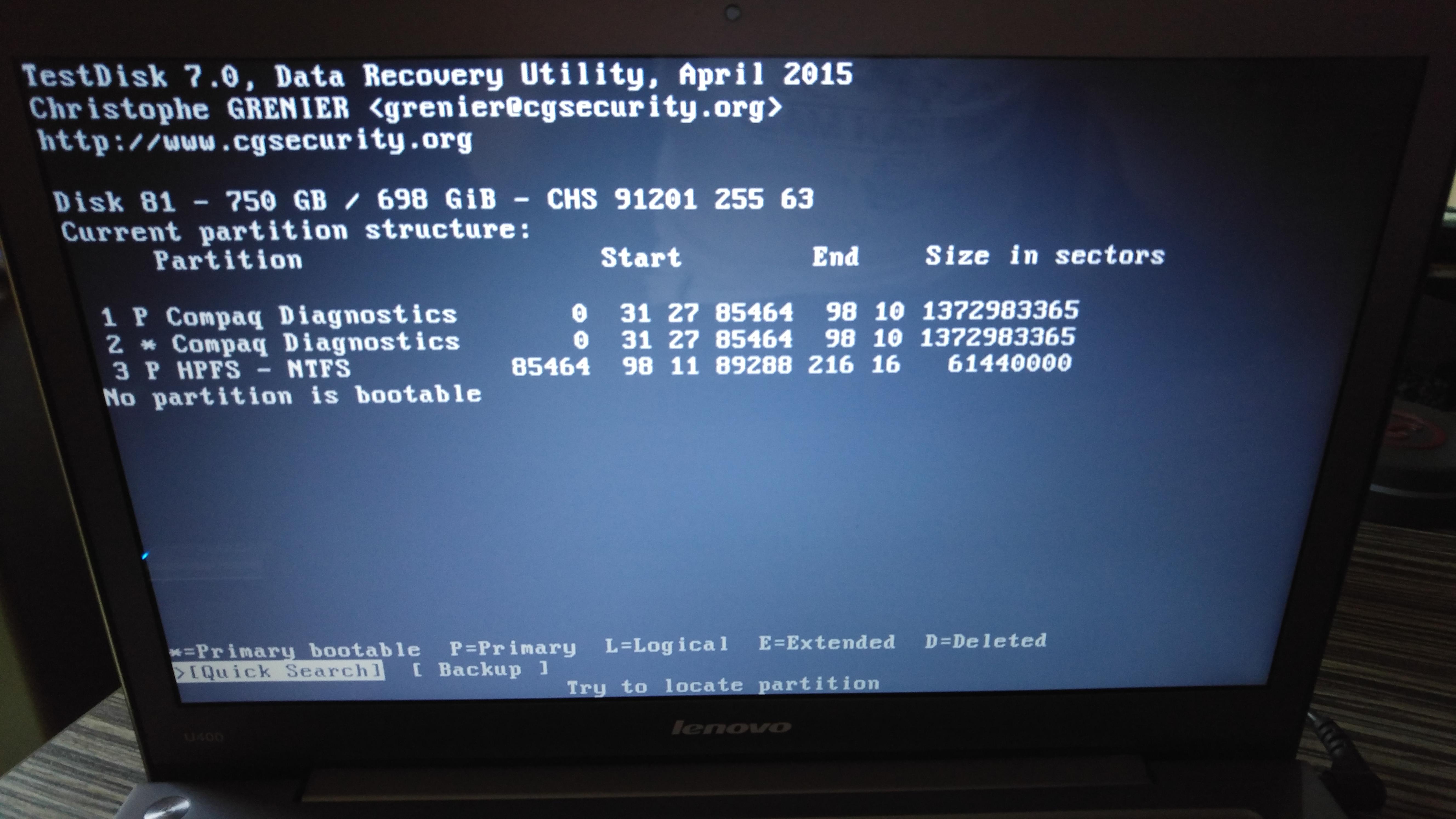 TestDisk (installiert auf DOS und damit angeguckt) sagt, wenn man hier von der Hauptpartition Sachen herauslesen möchte, das diese Ebenfalls nicht gelesen werden können, obwohl NTFS vorliegt.