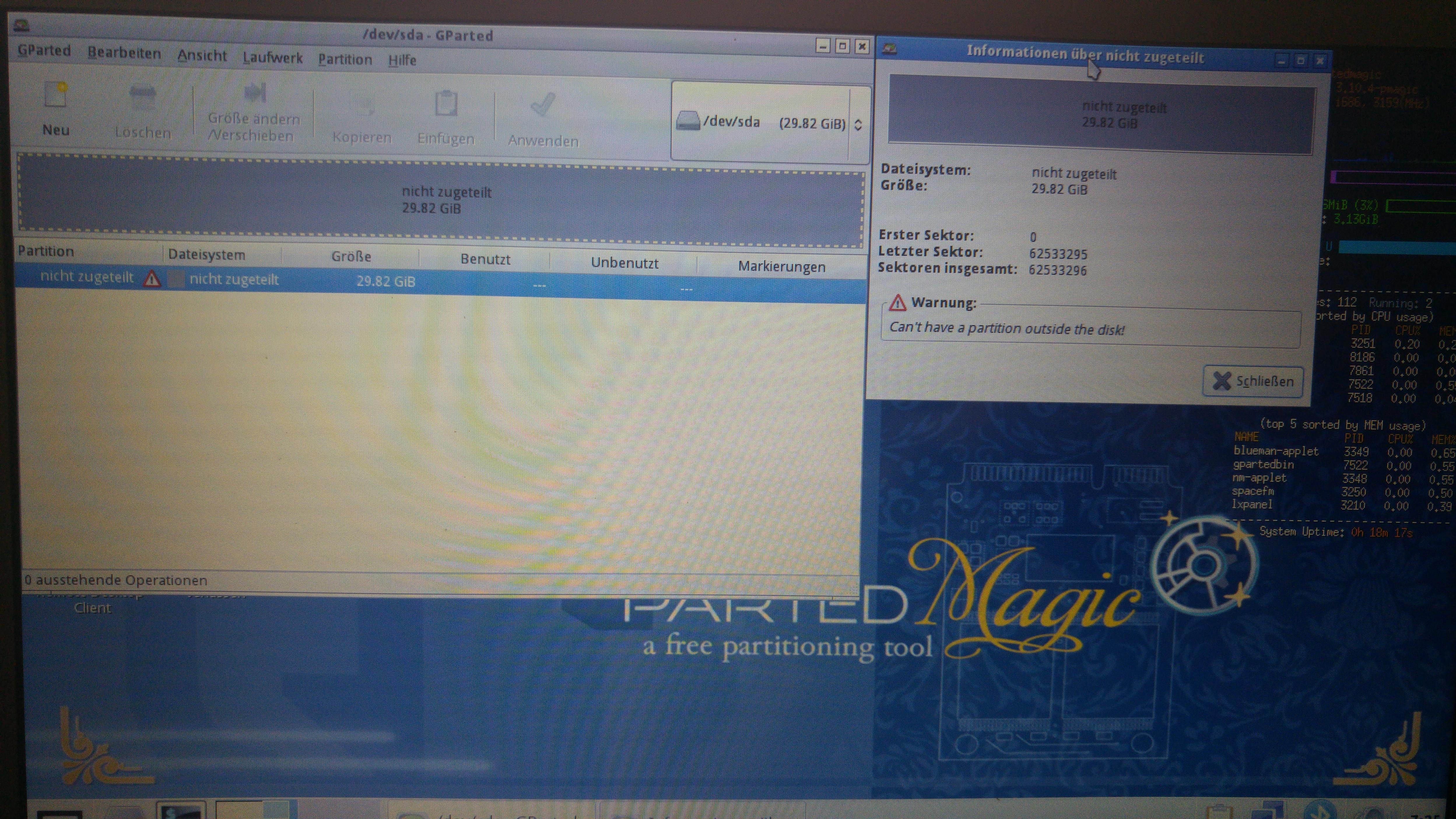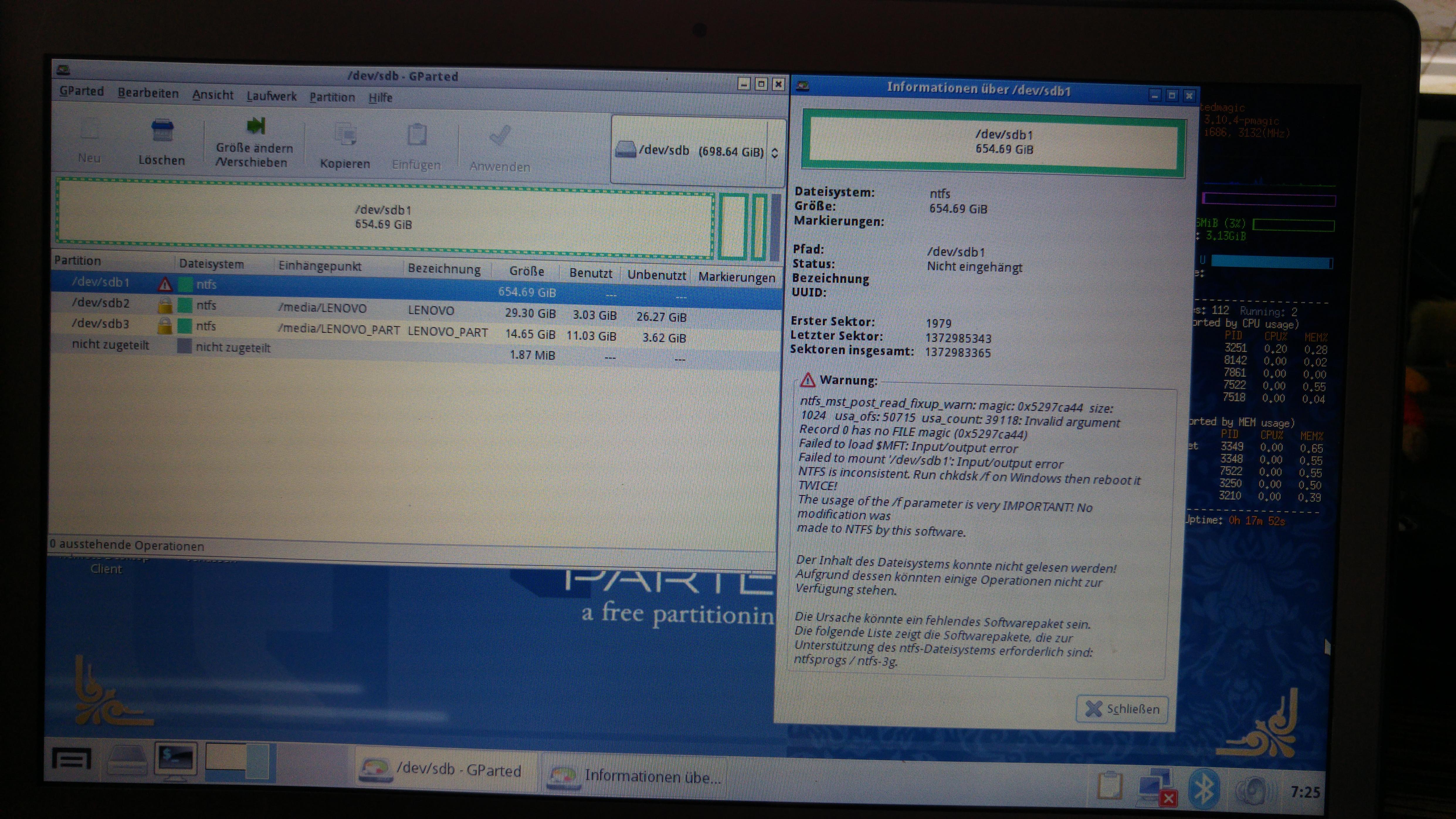 Die Hauptfestplatte kann man ausbauen, was ich zunächst auch gemacht habe, um zu gucken ob diese noch richtig läuft. Wird auch ohne weiteres Erkannt, jedoch kann die Hauptpartition nicht gelesen werden: