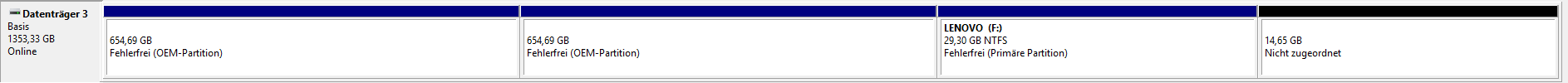 C: ist das Hautplaufwerk. Wenn man hier zugreifen möchte wird gesagt das die Platte nicht gelesen werden kann und sie muss Formatiert werden. D: ist eine Partition von Lenovo mit allen Treibern drauf, X: scheint die (Boot-) SSD zu sein, wo Paar Ordner wie Program Files, sources, Users & Windows drauf sind, jedoch nichts weiteres.