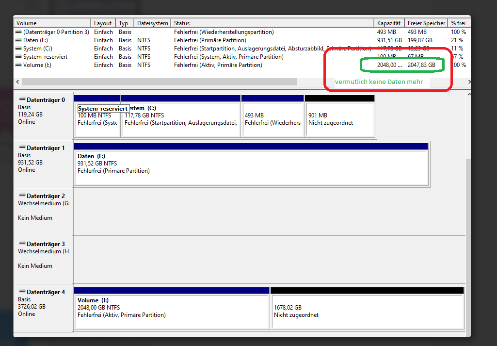 Ich habe dann mit "testdisk" die Patition wieder erstellt. Nur werden mir zwei Patitionen angezeigt eine leer und eine nicht zugeordnet. Ich habe die Hoffnung, dass meine Daten noch irgendwo auf der Platte sind (Filme und Bilder). Was kann ich tun? Gibt es einen Weg wie ich wieder an die Daten komme?