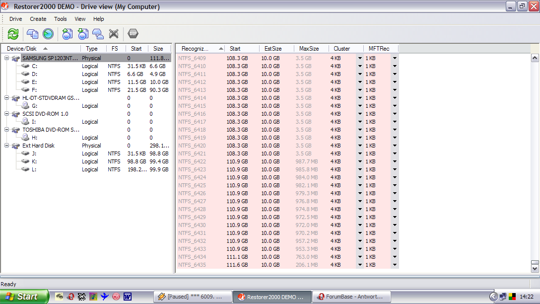 Folgendes hab ich bisher versucht: unter Knoppix ist nichts altes zu sehen, PC File Inspector stellt einen Haufen Daten wieder her, aber nicht das was ich bräuchte, Easy Recovery hat mir ein Word-Dokument angezeigt welches aber nur aus Kauderwelsch besteht & der Restorer 2000 bringt nur eine Fehlermeldung (hab ich mal angehängt).