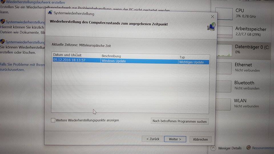 Neben der starken Langsamkeit ist seither die Datenträgerauslastung fast immer bei 100% (CPU manchmal auch bei 100) und ich habe das größere Problem dass meine WLAN-Funktion dadurch scheinbar nicht mehr geht. Er schafft es nicht sich mit dem Wlan zu verbinden, obwohl alle anderen Geräte reibungslos verbunden werden konnten.