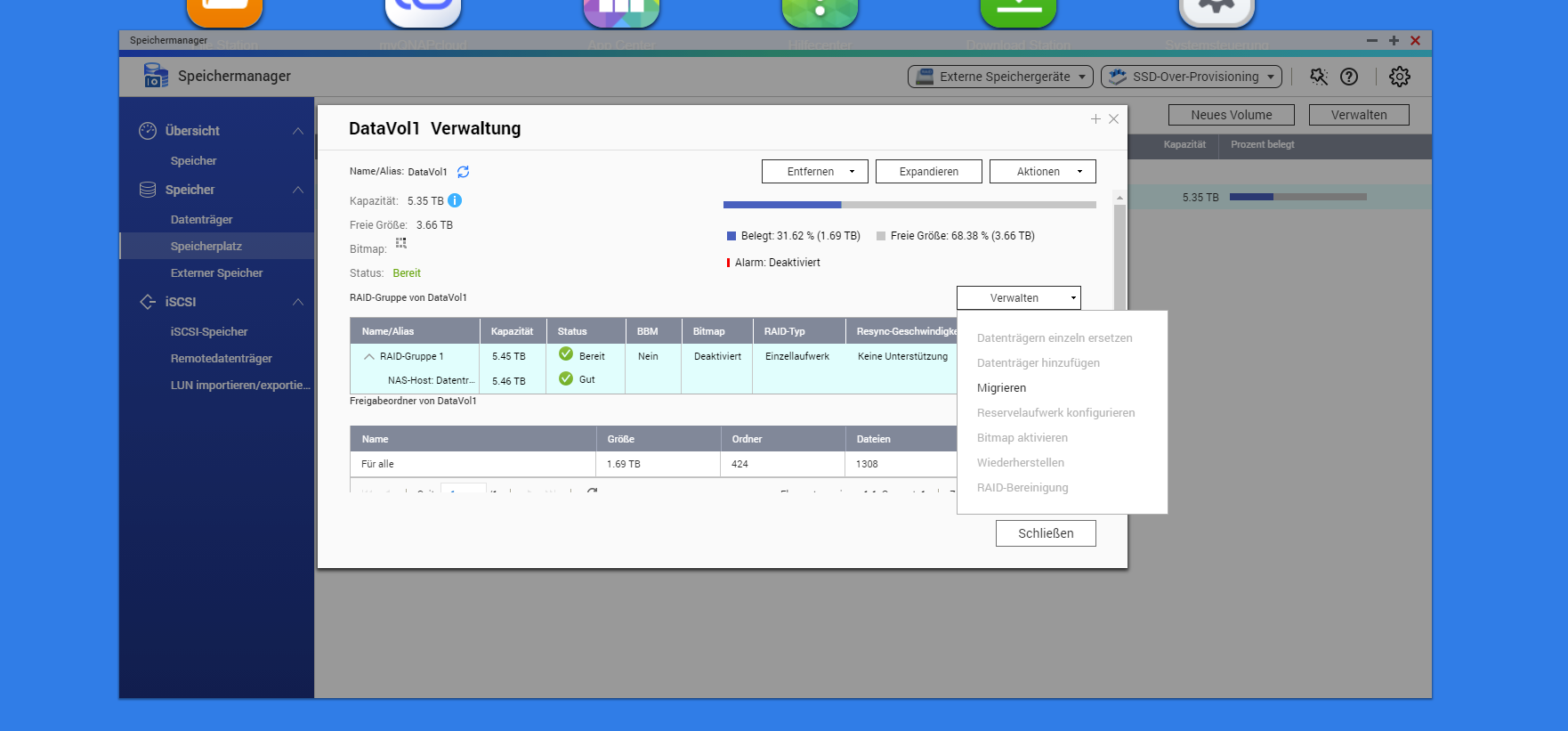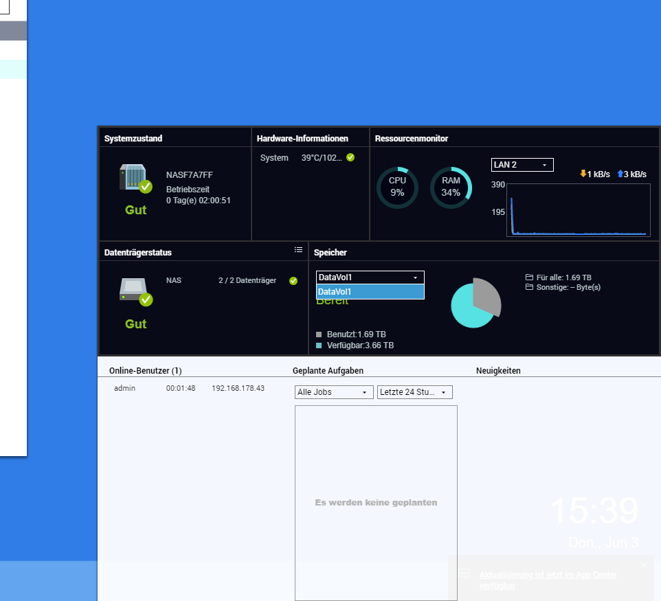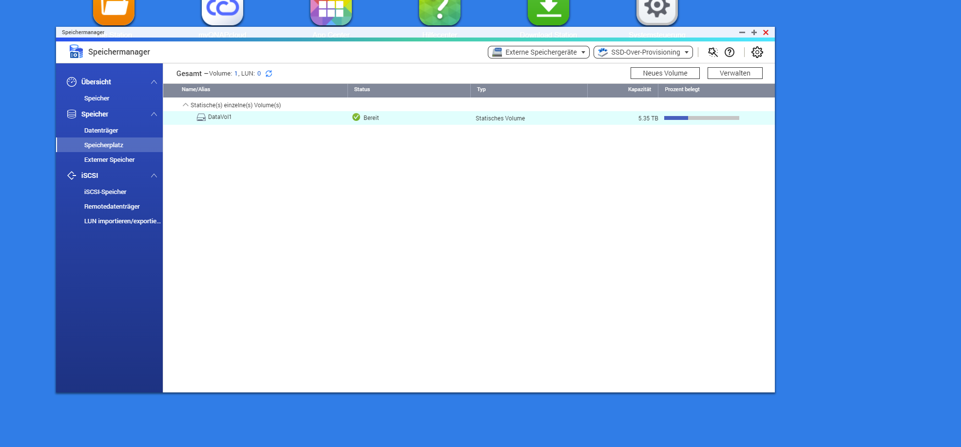 ich bräuchte bitte etwas Hilfe beim Einbinden der Ersatzfestplatte. Vor kurzem ist meine Hauptplatte im NAS ich glaube sie war ein Legacy Volume wo auch die ganzen Standardsettings vom NAS drauf gespeichert waren abgeraucht. Jetzt habe ich die neue rein gepackt aber Sie wird mir nicht direkt angezeigt und ich kann noch keine Ordner darauf erstellen. In der Systemsteuerung ist sie aber erkennbar und als gut eingestuft. Im Netzwerk unter Windows sind u.a auch noch die alten Ordner der vorherigen, defekten Platte angezeigt, auch das NAS gibt immer wieder Hinweise, dass diese Ordner nicht mehr funktionieren, solange die Festplatte nicht aktiv ist oder eingebuden wird.