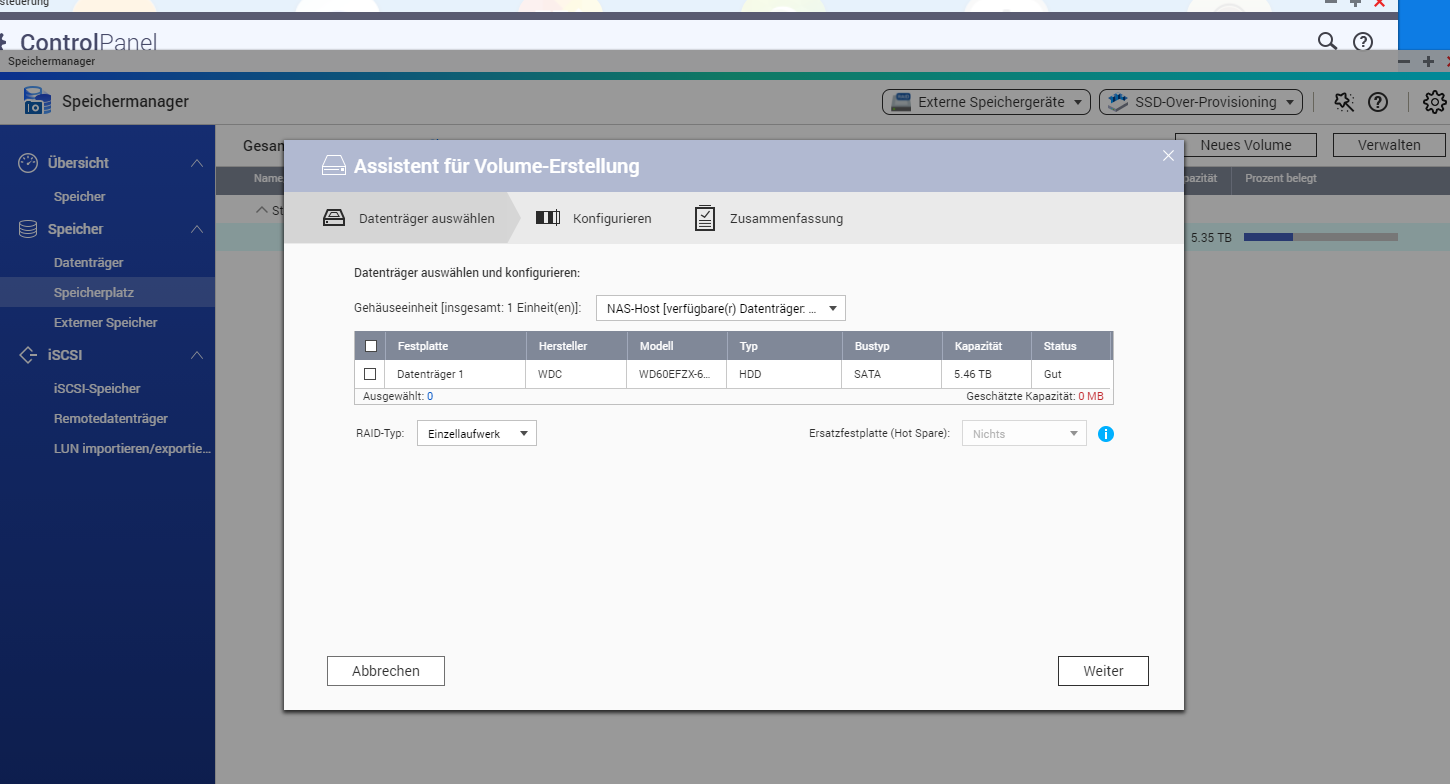 Also hier sind mal ein paar Screenshots, die Meldungen sind wie ich mir auch denke noch die Verlinkungen zur Hauptplatte die abgeraucht ist. Anbei auch ein Screenshot wo die neue WD Red 6TB angezeigt wird, aber auch ein Screenshot wo ich keine Möglichkeit habe wie in dem QNAP Leitfaden bei Punkt 3, die Platte hinzuzufügen.