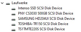 Mehr zufällig fiel mir die Tage auf, Windows zeigt sämtliche Laufwerke sowohl im Gerätemanager und der Datenträgerverwaltung als „SCSI Disk Device“ an und damit kann CDI noch andere (auch die Herstellersoftware) nach erster Recherche offenbar nicht umgehen.
