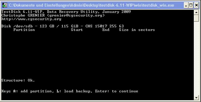 Bestätige mal in Testdisk durch, bis du das Menü Analyse siehst.