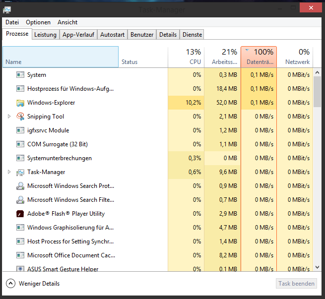 Nun hatte ich aber gestern das Problem, dass die Datenträgerauslastung ständig bei 100% war und ich Verzögerungen auf dem Notebook bemerkte. Das geschah während ich Lieder auf Youtube hörte, also nichts dass mein System stark belasten würde. Die Verzögerungen wurden immer extremer - Alles reagierte langsam und das Ausschalten dauerte bis zu 5Minuten.