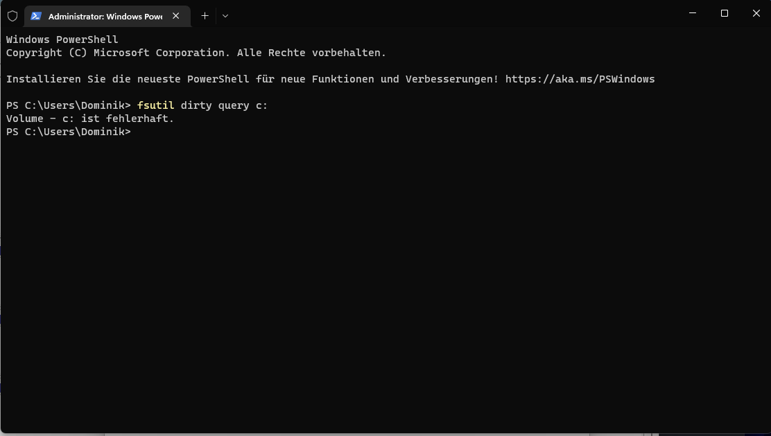- fsutil dirty query c (Volume C ist fehlerhaft wird ausgegeben)