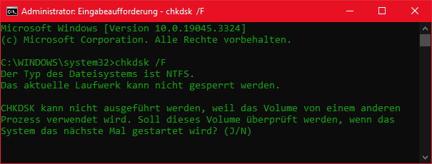 Wenn ich den chkdisk Befehl eingebe, der die Überprüfung am Systemstart "erzwingt" passiert folgendes: