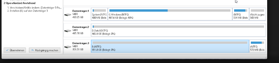 müsste wie man im Anhang sieht die zwei Volumen bzw. Partitionen zusammenführen bzw. die eine erweitern, damit ich den vollen Speicherplatz der Festplatte zur Verfügung habe