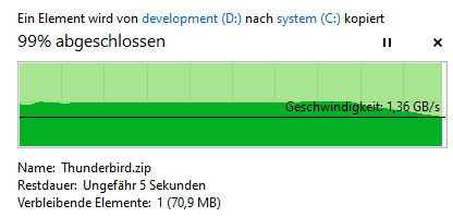 Ich weiß nicht weiter. Wenn ich zwei fixe NVMEs mit bis zu 6 GB/s Schreibrate verbaut habe, dann müsste eine 22GB Datei doch von einer zur anderen NVME mit mehr als knapp über 2 GB pro Sekunde kopieren, oder sehe ich das falsch? Stehe da gerade etwas auf dem Schlauch und bin geneigt, Windows neu zu installieren.