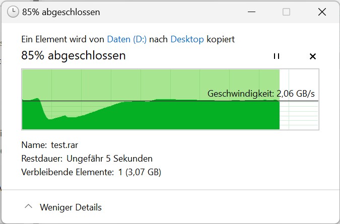 Gleiche Transferrate von rund 2 GB/s habe ich auch, wenn ich innerhalb einer NVME die Testdatei vom Desktop in einen anderen Ordner kopiere.