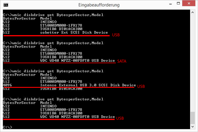 Nun ereilt mich das Problem der emulierten Sektorgröße, in das ich mich die letzten Stunden eingelesen habe. Ich habe drei verschiedene USB-Adapter zur Verfügung, zusätzlich habe ich die Platte an einen internen SATA-Slot gehängt.