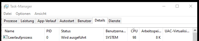 - CPU-Auslastung ist im IDLE-Betrieb, laut Task-Manager, dauerhaft auf 100%. Allerdings wird mir im Process Explorer angezeigt, dass die CPU nur 1-2% ausgelastet ist und der "Leerlaufprozess"-Dienst ist eigentlich auch immer bei 98-99.