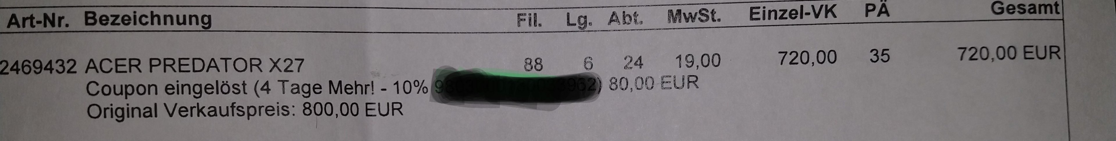 Das ist super. Darf ein gewisser Asus1889 ja nicht erfahren, kriegt sonst noch Herzinfarkt, denn seine Monitore reifen wie Wein... Nicht. Auf jeden Fall für einen Acer X27 ein Super Preis. Wird wohl erst mit deiner nächsten Grafikkarte komplett ausgefahren. Aber auch mit einer 2070S sind gemütliche 80-90fps meist möglich, wenn man die Regler bedienen kann.Thaddeleus schrieb:Genau genommen waren es 720€. Kann die Rechnung zeigen. Aber ich dachte, wenn ich das sage, hält man mich nur für einen Troll XD. Ich hab mich sowieso schon wie ein Dieb gefühlt...