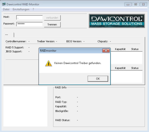 Nur konnte man seither direkt in Windows mit dem installierten "RAID Monitor" den RAID Status abfragen. Das geht jetzt nicht mehr. Wenn man die Software "Raidmonitor" aufruft erhält man die Meldung "Keinen Dawicontrol Treiber gefunden".