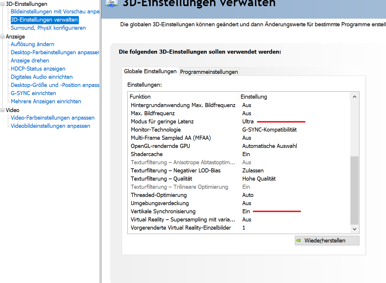 Wenn ich richtig informiert bin, braucht man kein Vsync mehr im Treiber für das richtig Gsync Setting, sondern begrenzt mit "Max. Bildfrequenz". Immer so 3 FPS unter der machbaren Frequenz von Gsync.Celinna schrieb:bei mir ruckelt garnix, wichtig ist halt VSYNC im Spiel AUS, im Treiber Vsync: an und Low Latency: Ultra siehe Bild