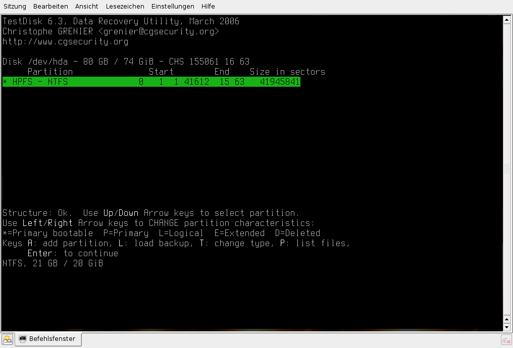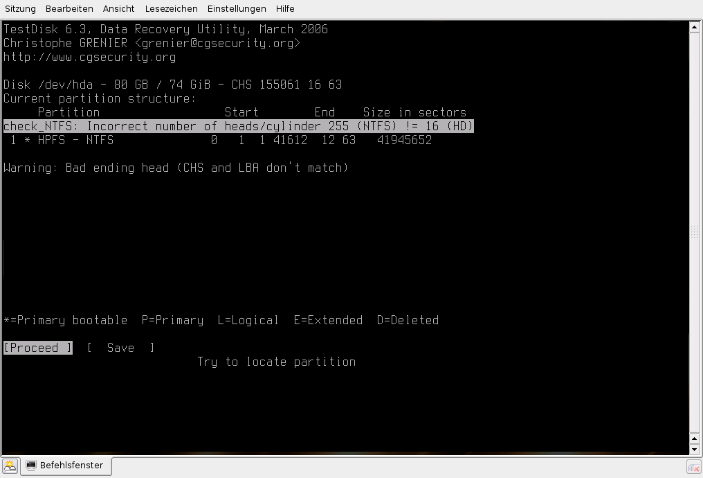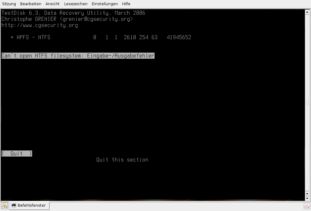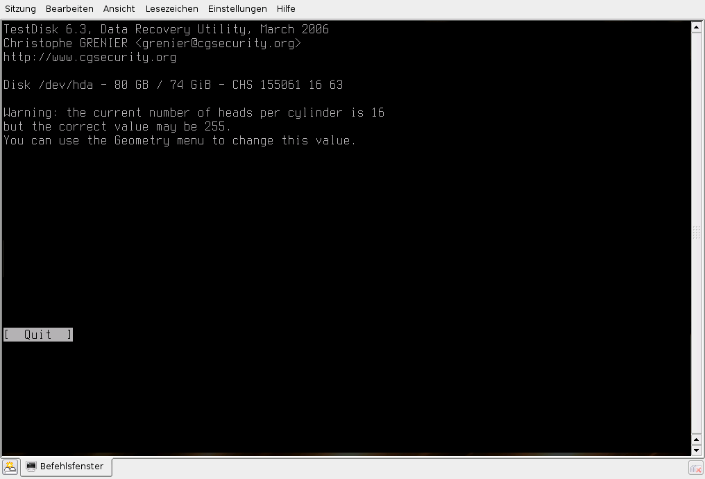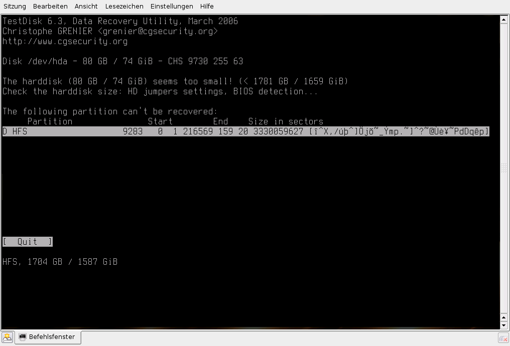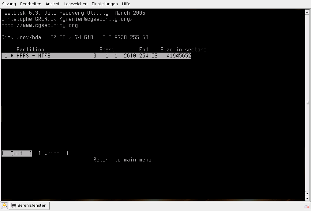 Da fällt mir noch was ein: zu Beginn wurden beide Partitionen von Testdisk auf der Festplatte gefunden. Jedoch wurden sie auch doppelt angezeigt. Bei einem Versuch mit Photorec 6.3 (ebenfalls auf Knoppix 5.0.1) wurden mehrere Dateien auf der Systempartition gefunden. Jedoch brach Photorec recht schnell mit der Suche ab, da zuwenig Speicherplatz (?) im recup_dir directory sei.