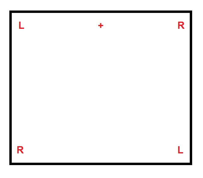 Kleine Skizze meines vorhabens, das "+" ist die Position des Radios/Verstärkers im Raum "L" wäre eine linke Box und "R" eine rechte Box! Dies Kabeltechnisch zu verlegen ist sicherlich kein Kinderspiel...