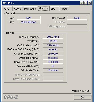 nun habe ich zusätzlich (weil ich zufällig grade diese günstig erstehen konnte) 2 module CSX PC3200-1024 mit den timings 3-3-2-8 (laut hardware-schotte) eingebaut.