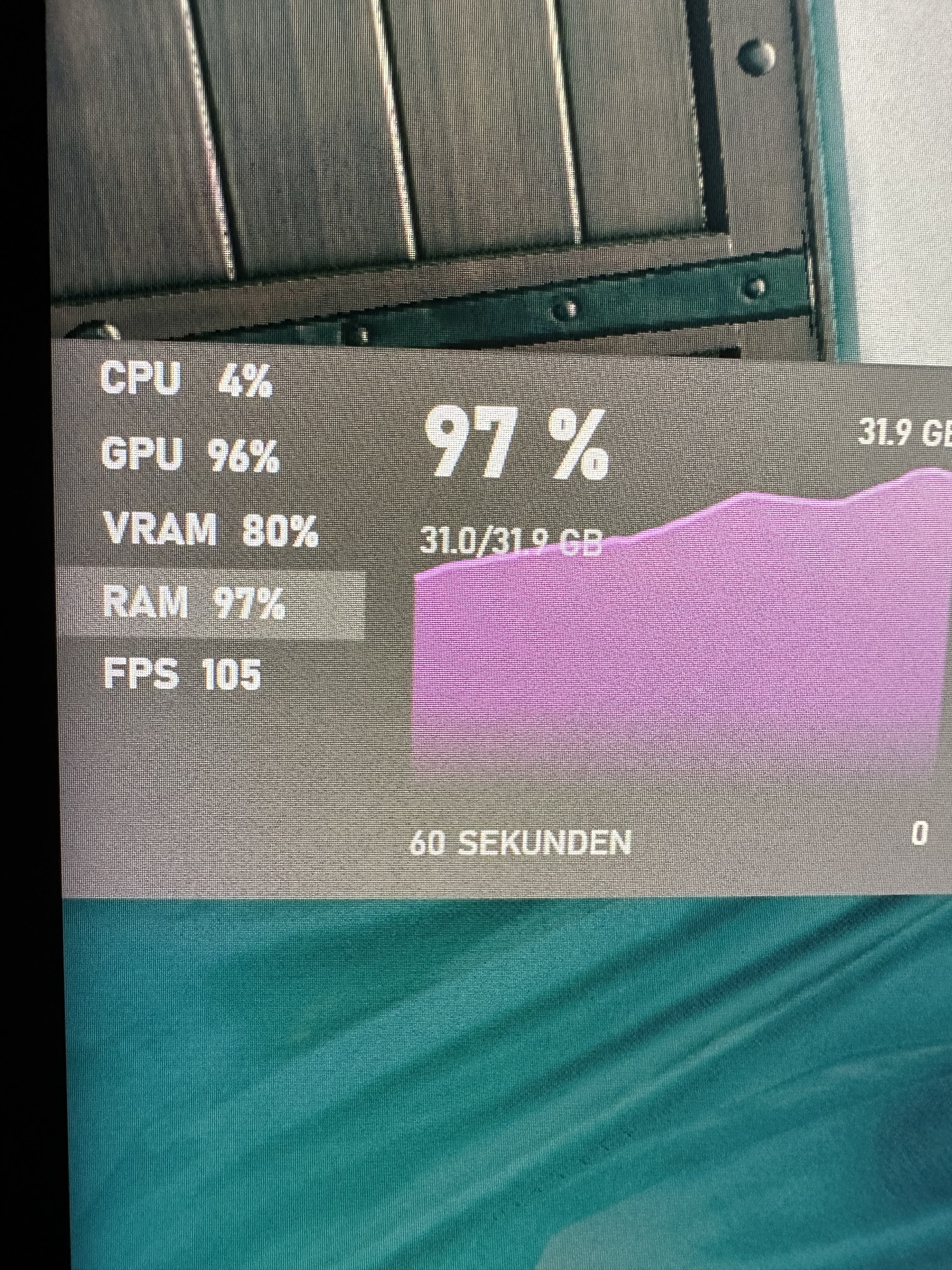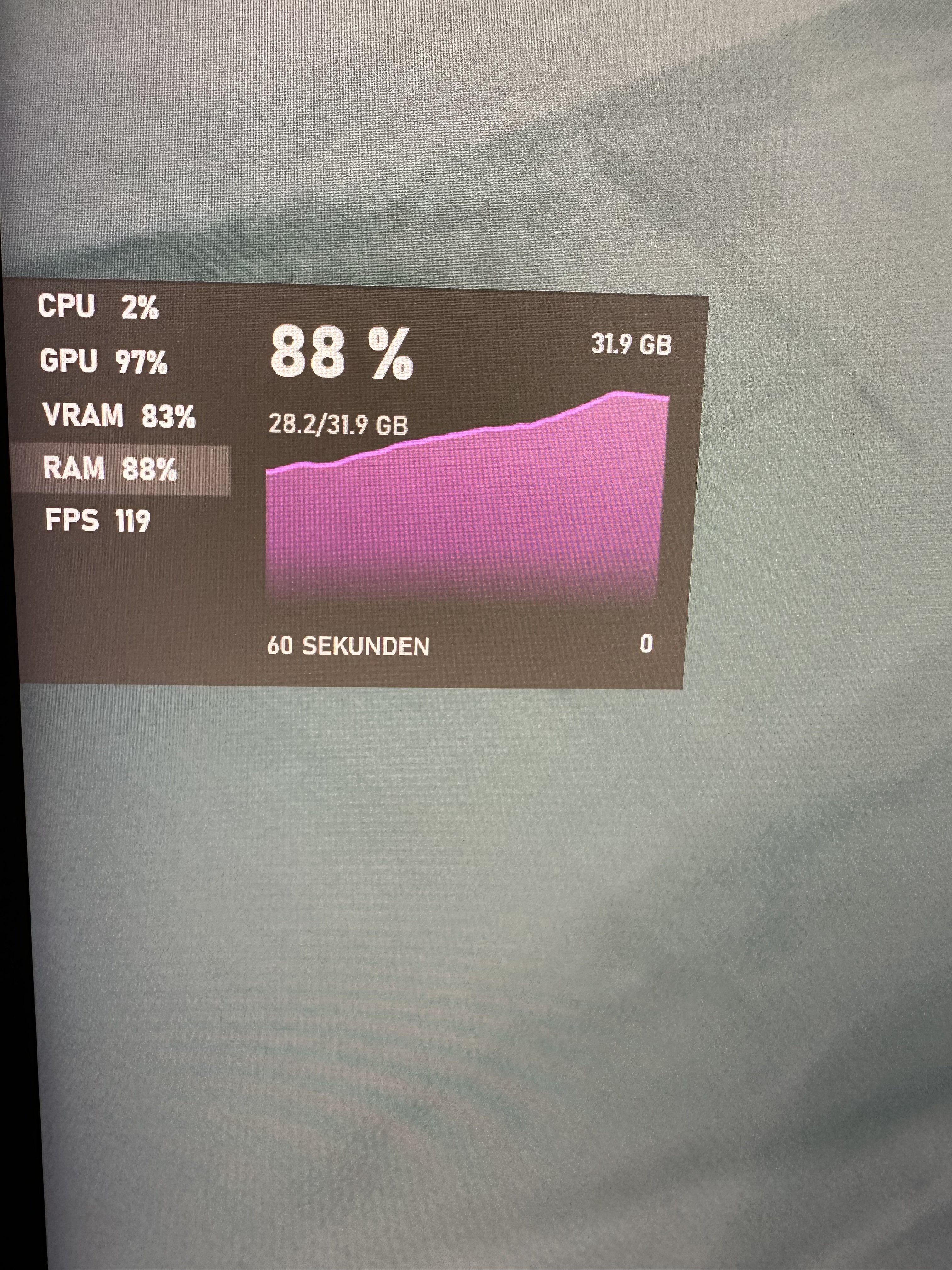 Mittels der Steam Bar habe ich die Leistung während des Spiel anzeigen lassen und da konnte ich sehen, dass teilweise die GPU und RAM 100% erreicht.