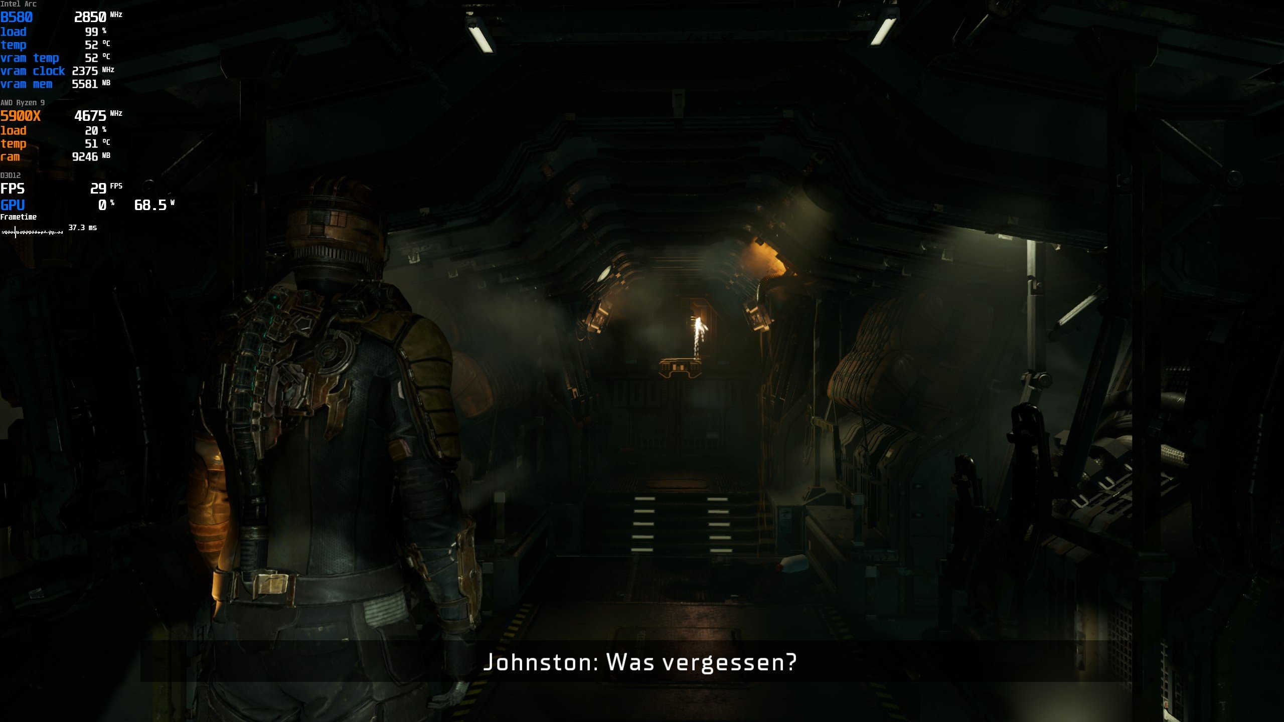 nach dem Download von Dead Space remake startet ihr es ganz normal stellt eure grafiksettings ein und beendet das spiel. Dann startet ihr es wieder und beginnt ein neues spiel , schaut euch die Introsequenz an. Dann werdet ihr feststellen das die Intel arc b580 nur 65 watt zieht und die fps im keller sind. geht danach zurück ins hauptmenü und startet wieder ein neues spiel , introsequenz bla bla bla 65 watt niedrige fps . Wenn ihr dann aber den spielstand manuell ladet vom ersten mal spiel beginn , Intel arc b580 120-130 watt und die 100 fps statt 31 .